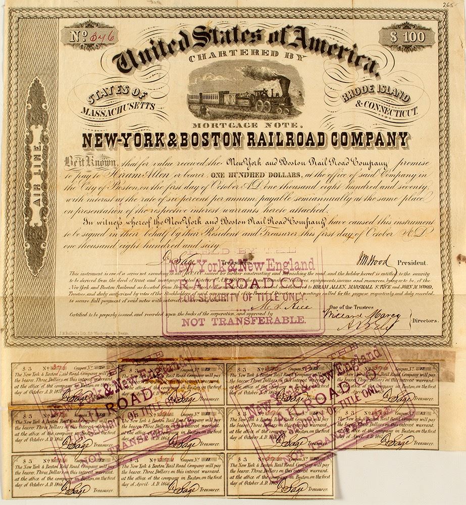 $100 bond issued in 1860. Stamp cancelled. Signature of Wood as president. Eleven coupons remaining (held in place by tape repair). Small vignette of locomotive. Printed by J.H. Bufford, Boston. Delicate paper with deep folds and some separation. (Prag Collection) City: State: Massachusetts Date: 1860 hwac# 33957