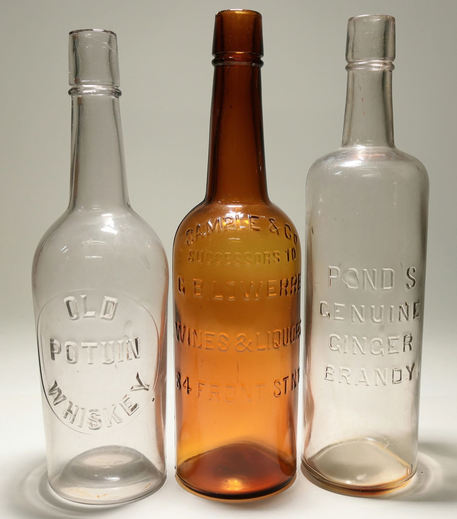 Lot includes Sample& Company amber, clear Old Protuin and a clear Pond's Genuine Ginger Brandy. No chips or cracks, but some bubbling. See photos for more details.