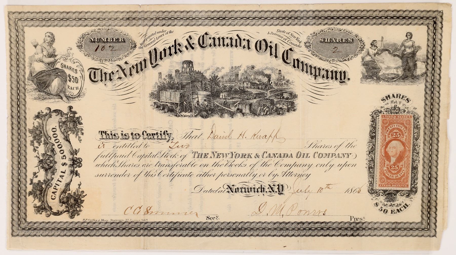 Inc. in New York and the Province of Canada. No. 102, issued for 2 shares to David Kwapp in Norwich, NY, 1866. Signed by president DM Powers and secretary CC Summer. Not cancelled. Black border and print. Three vignettes: oil operation scene with barrels and derricks (top center) and two allegorical (left and right corners). Printed by Corlies & Macy, NY. 25 cent US IR Power of Attorney stamp on right. Deep folds, some toning, rough edges. 6.5 x 11.25" No additional information located (likely northern NY/Canadian border?). New York Ken Prag Collection