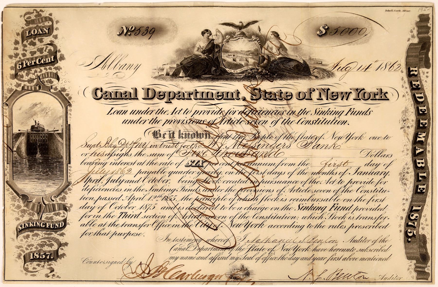 Impressive stock certificate issued by The Canal Department of the State of New York in 1862. It was issued by a man named Banks in the amount of $5,000. There is also a hand cancel by Banks. There's more info, but my lack of calligraphy interpretation is extensive, so i leave it to the purchaser to make out what they can. Two nice vignettes (One of a canal) and some fold creases. See photos for more detail and condition.