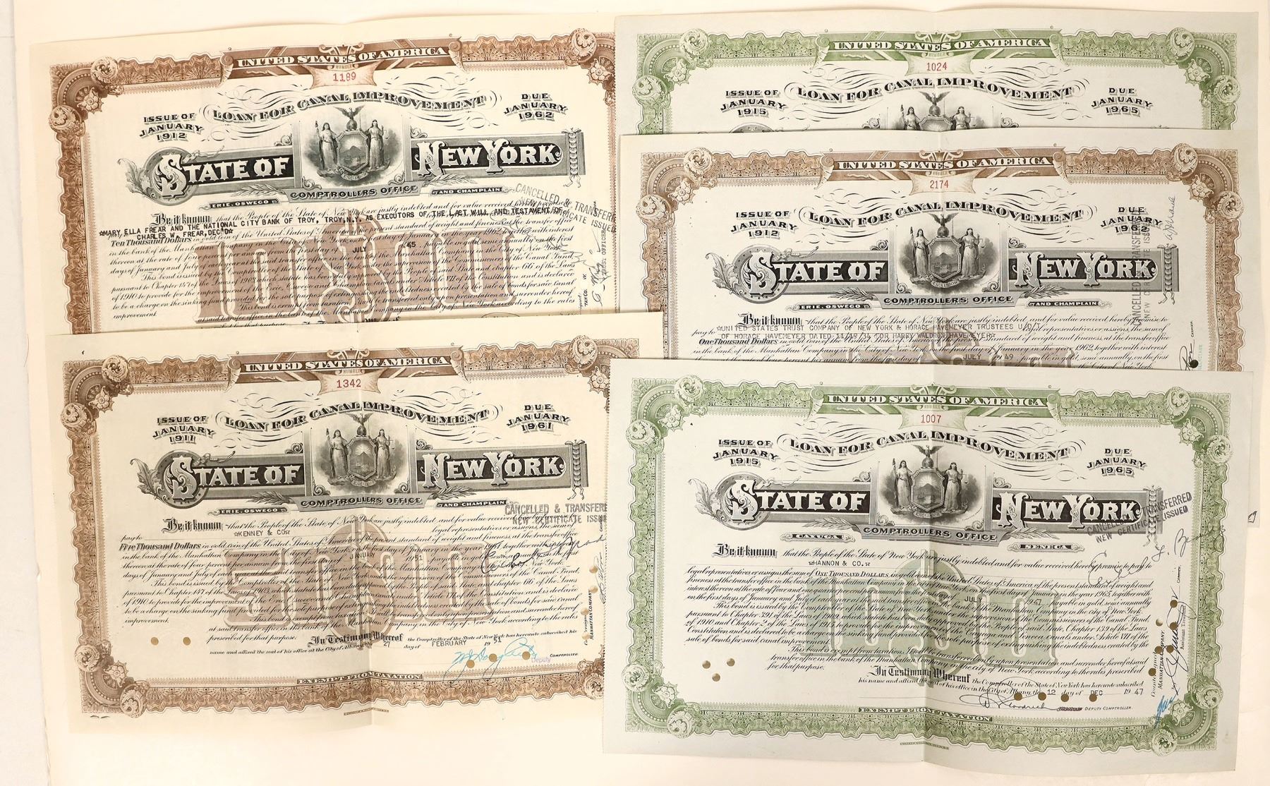 5 New York canal improvement bonds, 1945-51. 2x $1000 green, 1x $1000 brown, 1x $5000 brown