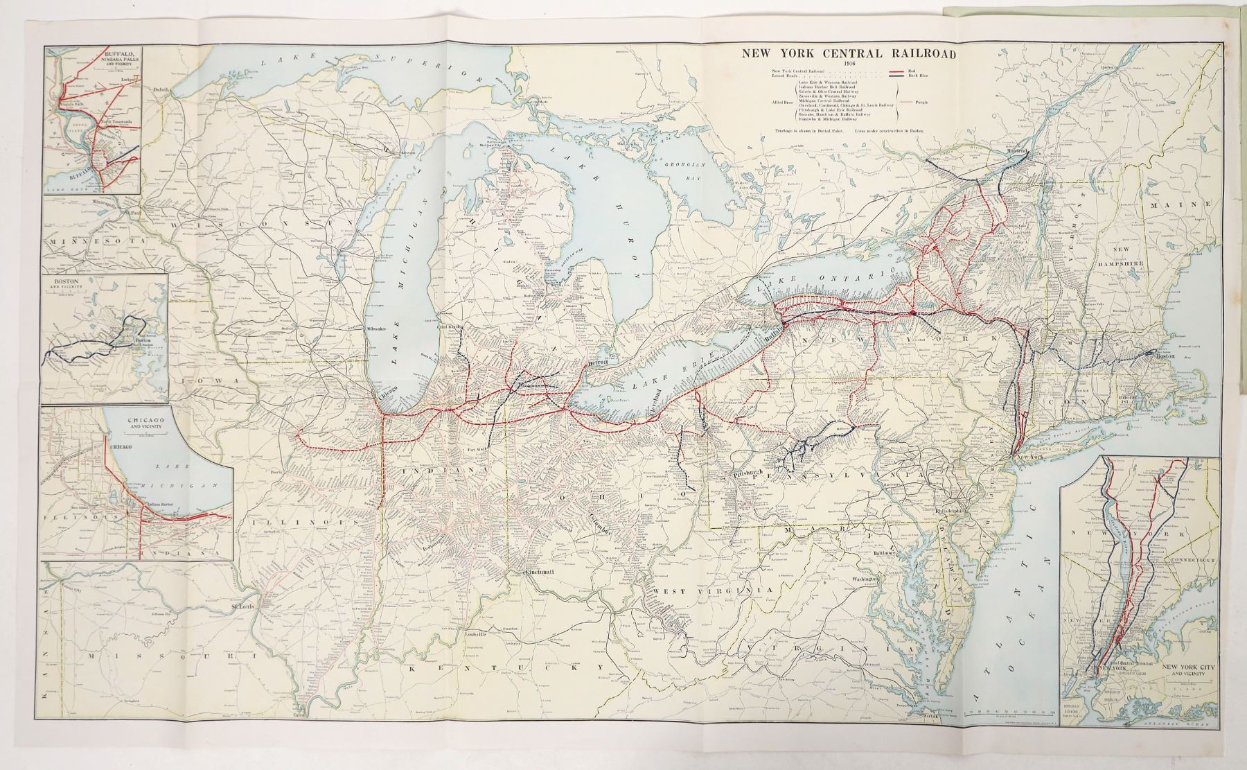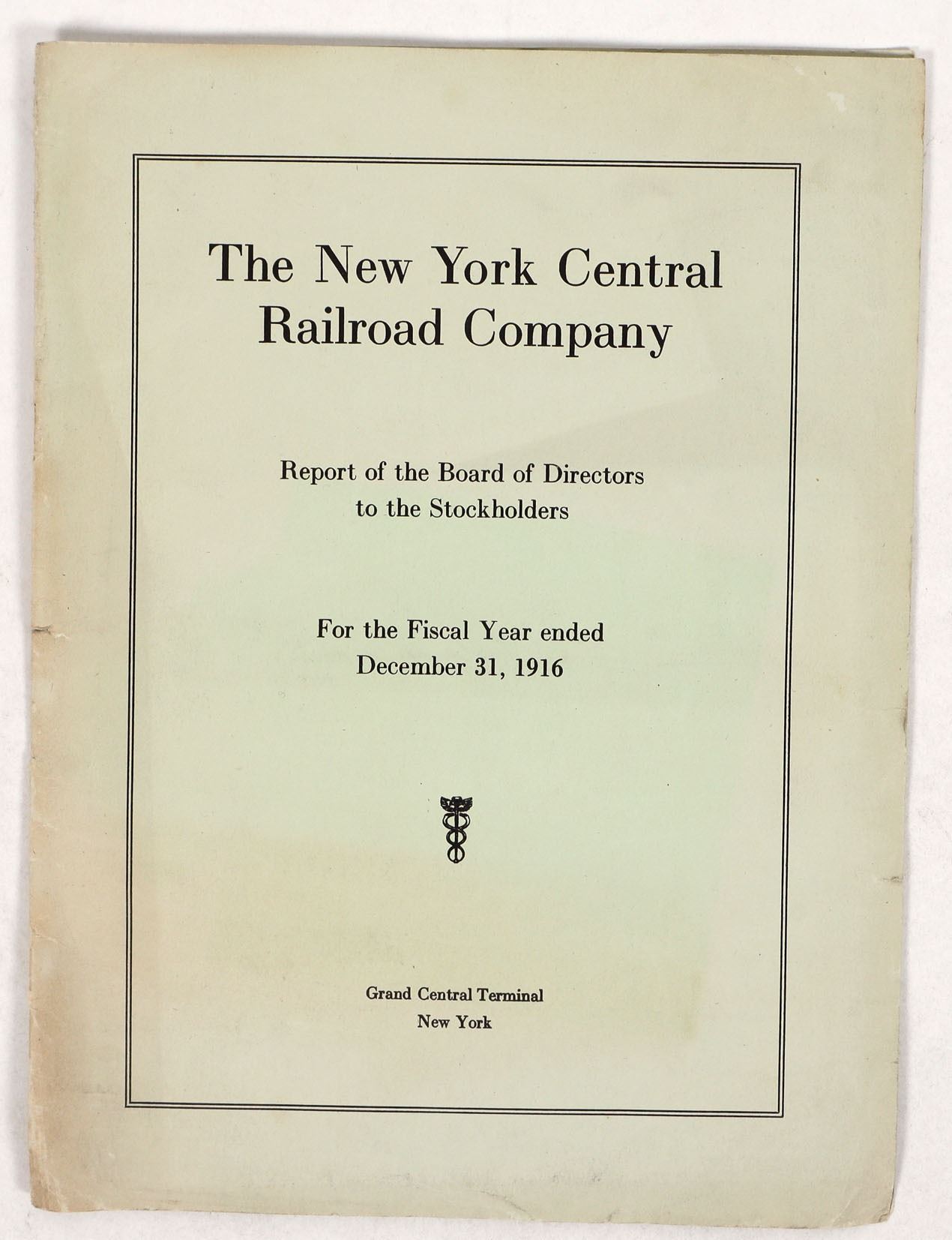 Report to the stockholders of the New York Central Railroad Company for the fiscal year of 1916. The report consists of a large, beautifully detailed fold-out map of the New England and Great Lakes region marked with the owned, leased, and allied lines of the company, along with the track currently in construction. The map itself is in good condition with minor staining.