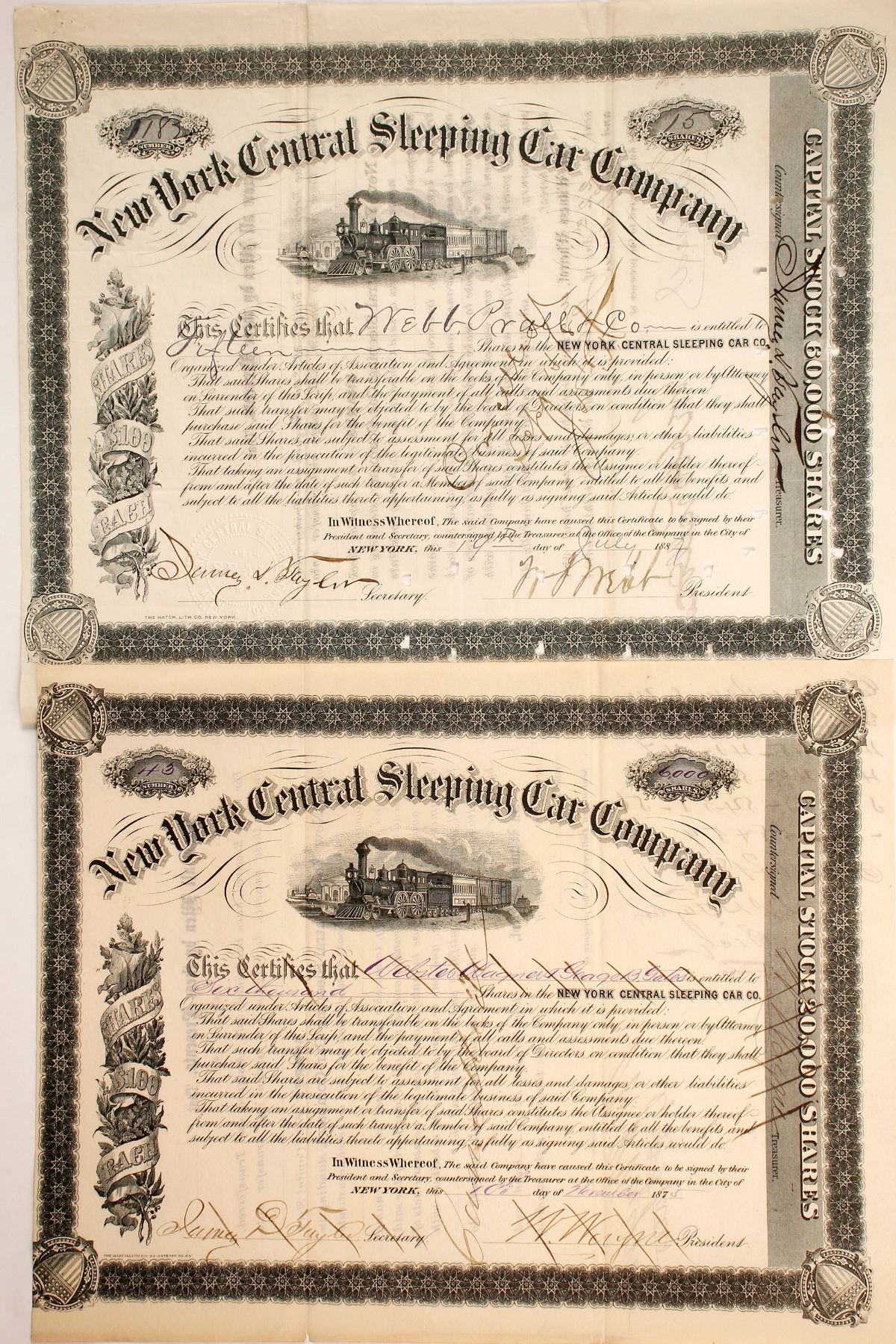 started in 1858 in New York. 1. I/C #43 for 6000 shares @ $100 par, issued November 10, 1875 to Webster Wagner and Geo. Gates (both founders), signed by W. Wagner president/treasurer (founder), cancel signed on reverse by Wagner and Gates, black, union shields at all four corners, vignette of train passing roman building, left fancy scroll and leaf stalks w/Shares $100 Each inside, The Hatch Lith. printer. 1. I/C # 1182 for 15 shares @ $100 par. Issued July 19 1887, signed illegible, embossed seal.. Certificate layout is same as prior mentioned. Ken Prag Collection