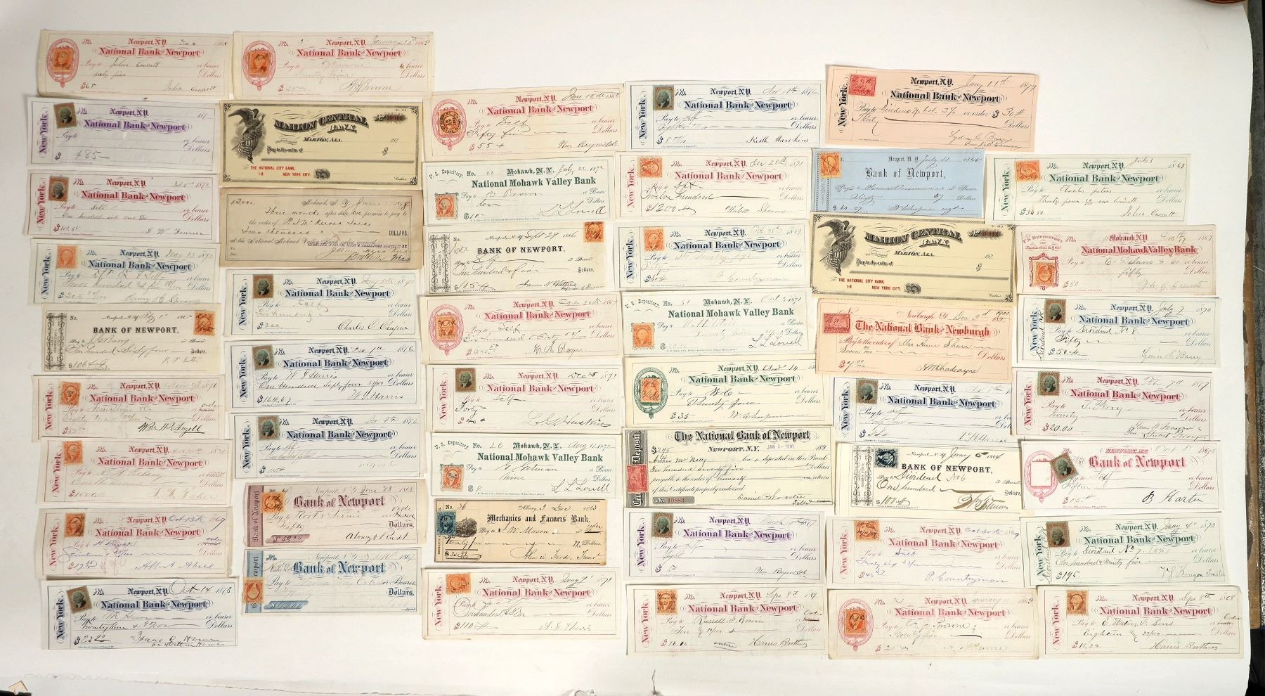 Group of 47 used checks from a few different New York banks (mostly the National bank of Newport, NY), dating 1860s-1890s. Most date 1860s and 1870s. Lot includes one blank check from the 1920s. Good condition; see photos.
