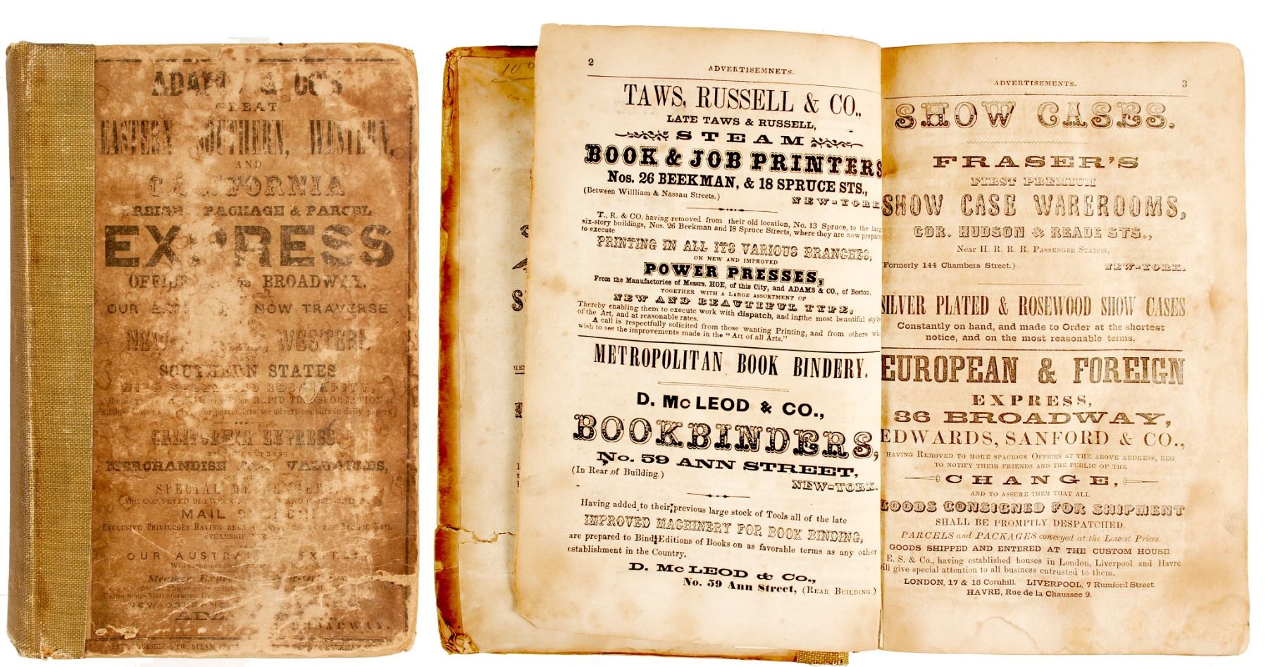 New York City directory for 1854 to 1855. Published by Charles Rogers, New York. Hard bound, ads present, rebound binding. Choice Gold Rush era reference book