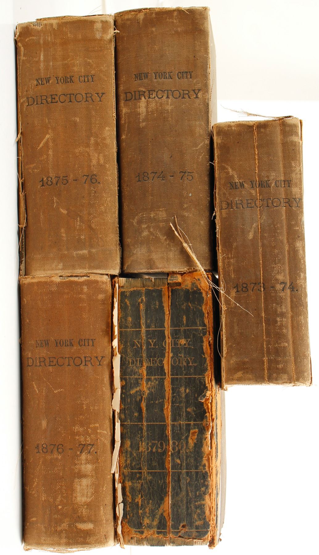 Run of New York city directories from the 1870's. 1873, 1874, 1875, 1876, 1879. All hardbound, all showing the effects of age, with weakness at hinges, cloth rebound etc. This is an absolute classic reference, and exceptionally important for research on Western mines, as the number of the Western Mines were financed in New York and these directories tell us about the people. Rare.