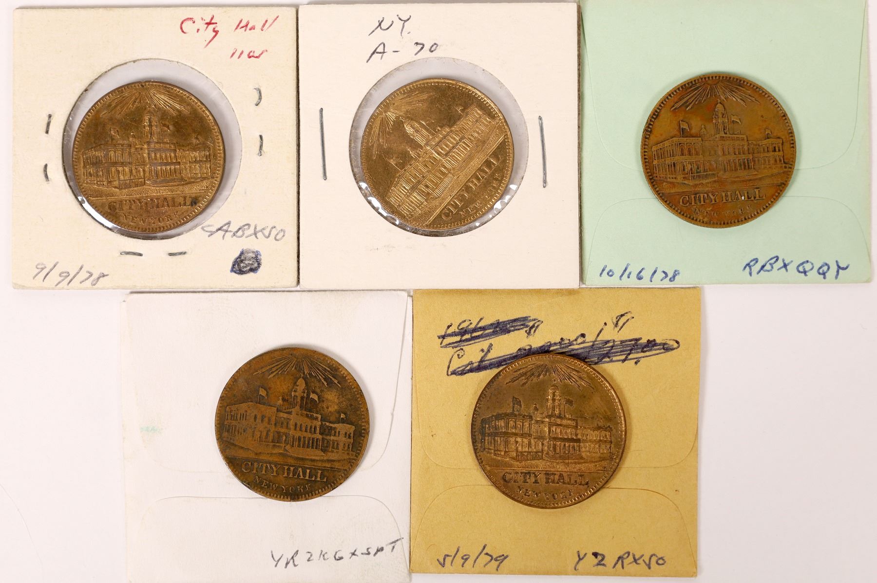Lot of five spiel markes in the $10 U.S. gold piece fashion. AU-Unc condition. Liberty head obverse, city hall reverse die 1105.
