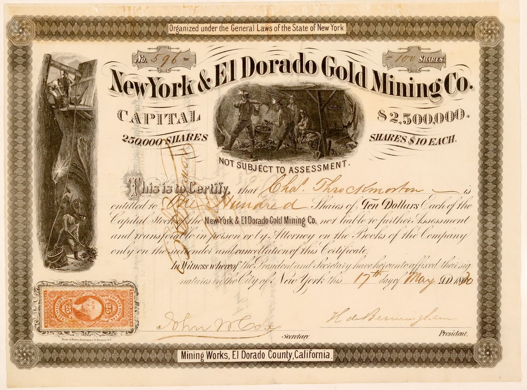Cert. #596, issued for 100 shares in 1870 to Chas. Throckmorton. Signed by John McCoy as secretary and Berringham (illeg) as president. Two fabulous mining vignettes with the one at left having a miner filling an ore bucket and two above ground to haul it up. A miner's candle is stuck into the left side of the wall shining brightly. At center is another vignette of a group of miners with lights on their helmets. This company operated in El Dorado County, California. The company's lodes included the Wanderer, New England, Vanderbilt and Yosemite (worldcat.org). The certificate doesn't appear to be cancelled, although it has a signature of S. Bronson across the face. Howe & Ferry, N.Y. Rare.