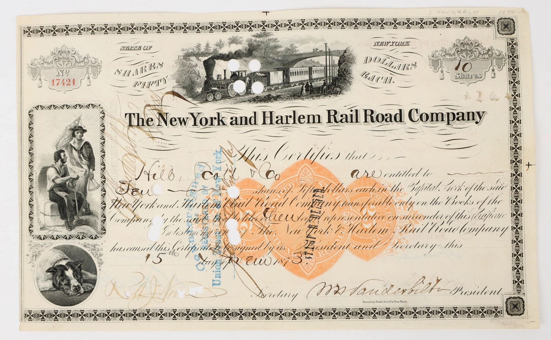 No. 17421, issued in 1873 for 10 shares. Signed by WH Vanderbilt as vice president. RN-U1 imprinted revenue. Punch cancelled. Three vignettes, one train, one dog and coupon with flag. Black ink and border. New York and Harlem Railroad (now the Metro-North Railroad Harlem Line) was one of the first railroads in the United States and may have been the first street railway. Incorporated April 25, 1831 the road opened May 10, 1852 to link New York City with Harlem. Designed by John Stephenson, opened in stages between 1832 and 1852. John Mason, one of company's founders and second president from 1831-1839 was a wealthy banker and president of Chemical Bank ("father of Chemical Bank") was among the largest landowners in New York City who owned big area of what is now Midtown Manhattan. Served as New York and Harlem Rail Road's second president. William Henry Vanderbilt, who signed the stock as vice president of the New York and Harlem Rail Road Company, was the son of "Commodore" Cornelius Vanderbilt the American business magnate and philanthropist.