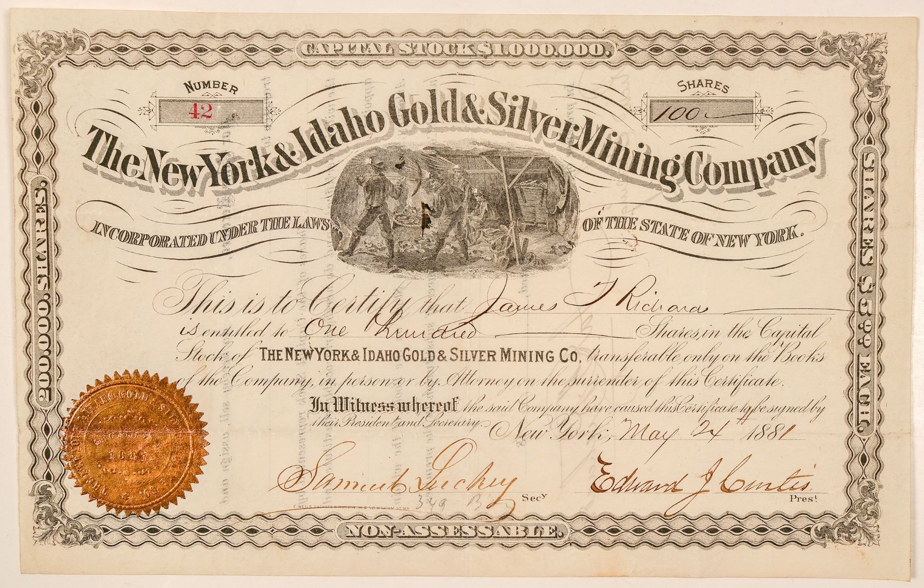 Inc. in New York. No. 42, issued for 100 shares to James T. Richards on May 24th, 1881 in NY. Signed by president Edward J. Curtis and secretary Samuel Pickey. Not cancelled. Black border and print, gold seal, underground mining vignette. Printed by E. Wells, Sackett, & Rankin. 7 x 11" Pinholes, folds. According to An Illustrated History of the State of Idaho, 1899, the company shipped a 30-stamp mill to South Boise in 1863. Formed by RB Farnham. Ken Prag Collection