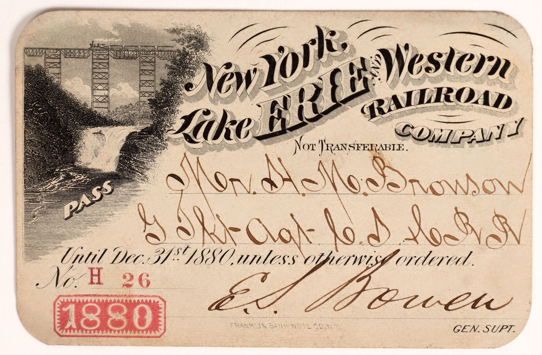 Very attractive pass with a vignette of a train crossing a bridge over a waterfall. Pass no. H26, issued for 1880 to HM Bronson of the CS&CRR. Signed by the general superintendent (E.S. Bowen). Black and red print on cardstock. Printed by Franklin Bank Note Co. Originally the Erie Railway. Took on this name in 1878. Went into bankruptcy in 1893 and became the Erie Railroad in 1895.