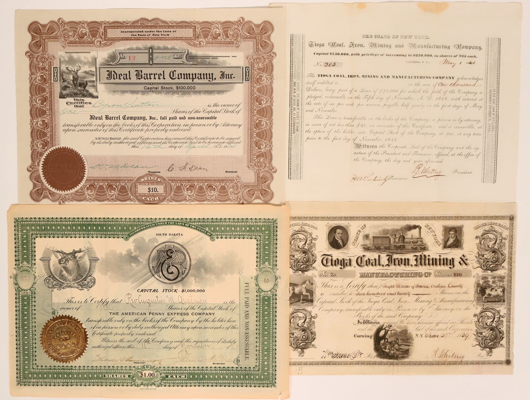 1. Tioga Coal, Iron, Mining & Manufacturing Co. - Incorporated April 9, 1828 and March 26, 1833. Lot of two. 1) Early # 25, issued for 220 shares to Joseph Fellows of Geneva, Ontario County. Signed by WIlliam Young Jr and president B Whiting. Vignettes include horse. cow, train, Native American and two distinguished looking gentleman. Printed by Draper, Toppan Longacre & Co. 2) Number 203 for $1,000. Signed by Bowen Whitney, president, and HW Bostwick, treasurer. 8.25" x 10.5" Some staining on top border. Very thin paper. According to the 1843 New York State Register, this company, along with the Tioga Navigation Co., merged to form the Blossburg & Corning Railroad. The coal and iron mines were located in Blossburg, PA. 2. American Penny Express Company Stock Certificate - Rare. Inc. in South Dakota. No. 673, issued for 10 shares to Rev. Augustine Quatman on November 11th, 1902. Signed by president Frederick Anderson and secretary James Ford. Not cancelled. 3. Ideal Barrel Company stock - Number 12 for 1 share to Byron Sutton in 1914. Signed by secretary W Dean and president C Dean. Colonel F. Dean was an original incorporator.