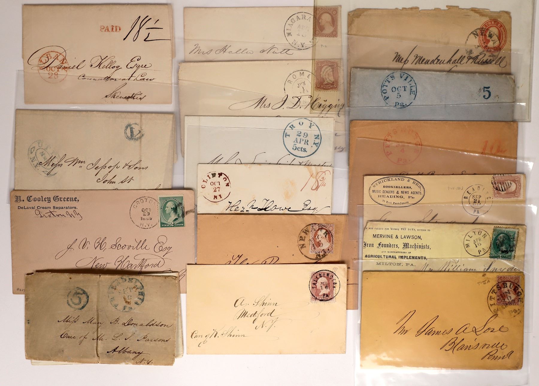 Lot of sixteen. 1) New York: EXTREMELY early 1823 Albany stampless letter with RARE 18 1/2 rate with contents, 1848 stampless letter with contents, Niagara, Rome, Clinton and Cooley Greene DeLaval Cream separators cc. 2) Two Newark with postmark as cancels. 3) Stampless Pottsville with contents, Stampless cover from Pittsburgh, advertising for Strickland bookseller of Reading, Mervine & Lawson iron founders of Meldon. 4) Pennsylvania: Stampless letter in rough condition.