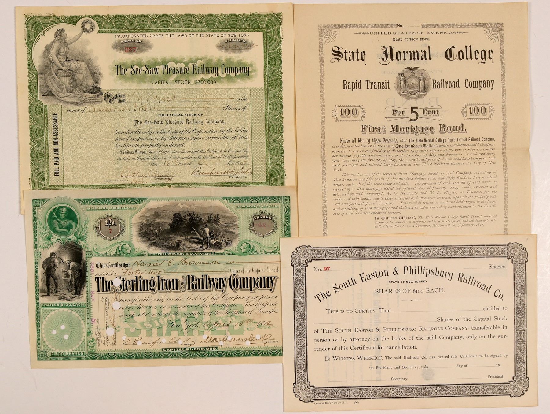 4 certificates. 1. Rapid Transit Railroad Co. incorp New York. U/U, 5%, $100 First Mortgage due 1915, dated Jan. 15, 1899, 250 authorized. State seal vignette, BLACK, unknown printer. 2. The South Easton & Phillipsburg Railroad Co. incorp July 25, 1889 New Jersey. #97, U/U, $100 par common stock dated 18__ , no vignette, BLACK, American Bank Note printer. 3. The Sterling Iron and Railway Co. incorp 1892 New York. #7, I/C, 42 shares common stock issued April 18, 1892, GREEN, embossed seal, vignettes: top men logging, left miners looking @rock. SHARES $100 green underprint. American Bank Note Co. 4. The See-Saw Pleasure Railway Co. incorp 1905 New York. #237, I/U, 17 shares common stock issued Oct. 16, 1902, GREEN, embossed seal, vignette seated liberty looking l-r. Albert B. King & Co. printer. Ken Prag Collection