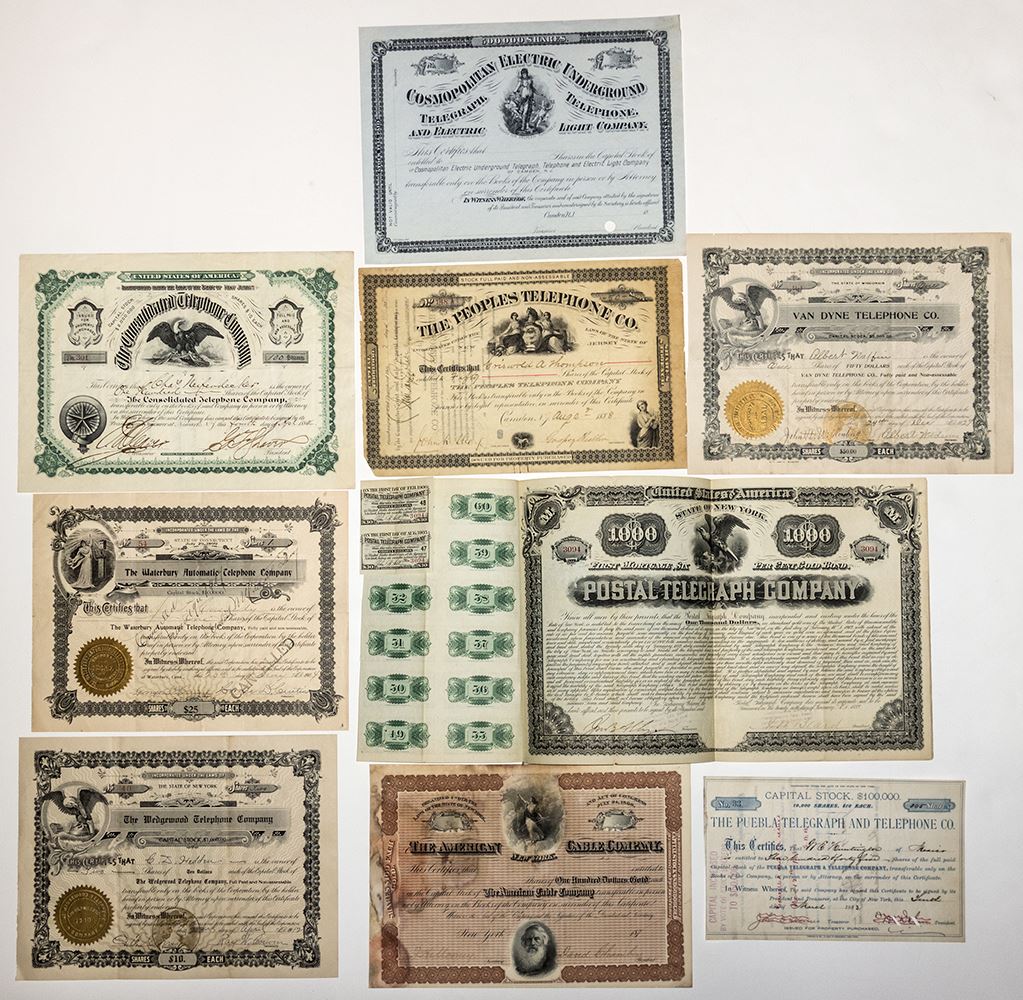 Nine stock and bond certificates from New York and New Jersey telephone companies: Consolidated Telephone Company (1884), The Peoples Telephone Co. (1888), unissued Cosmopolitan Electric Underground Telegraph, Telephone and Electric Light Company, Postal Telegraph Company, The American Cable Company, The Puebla Telegraph and Telephone Co. (1883), The Waterbury Automatic Telephone Company (1904)