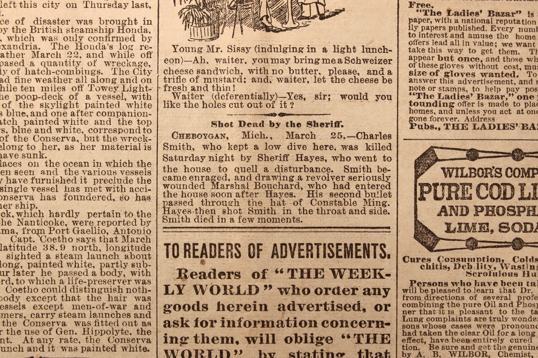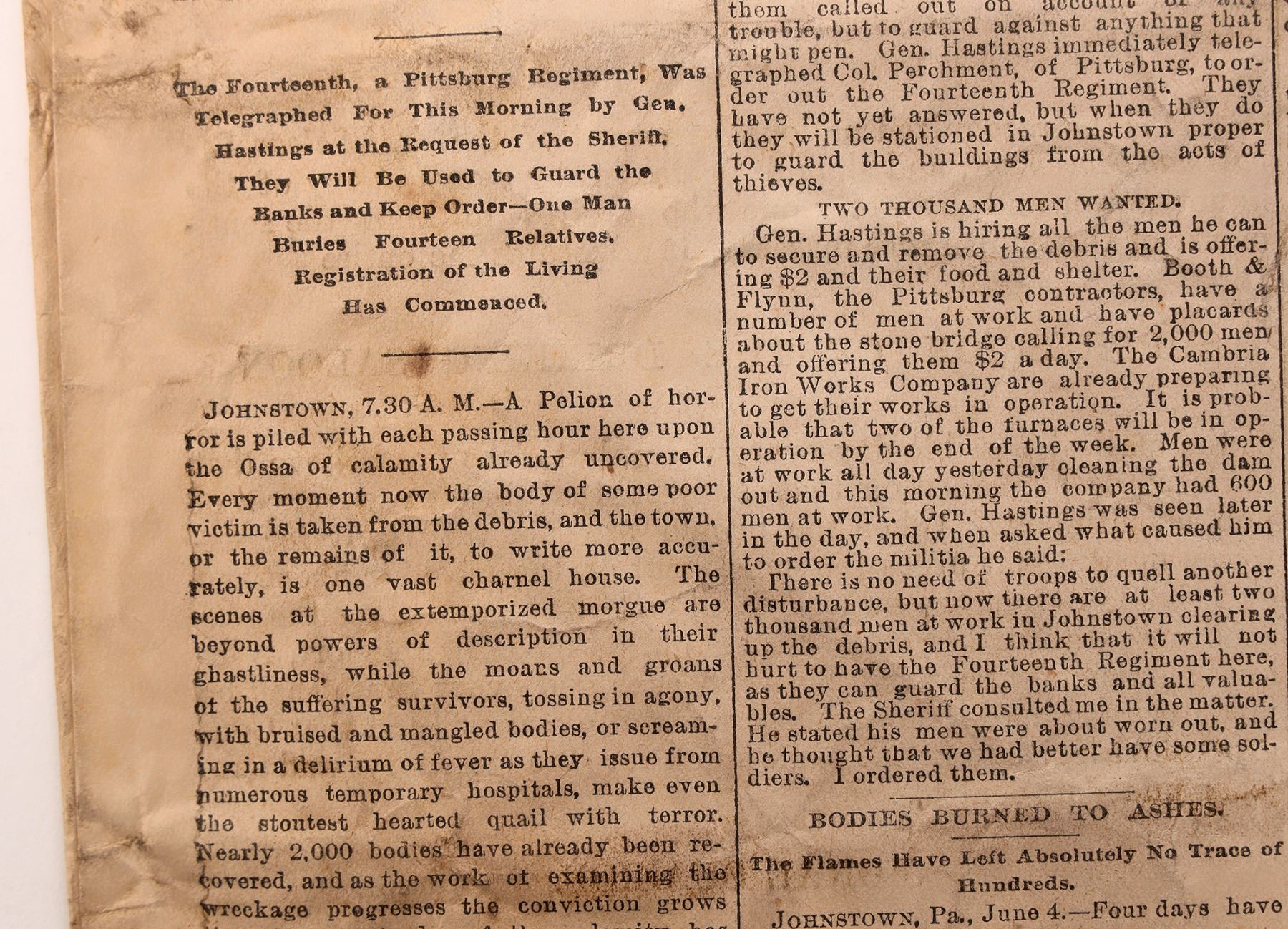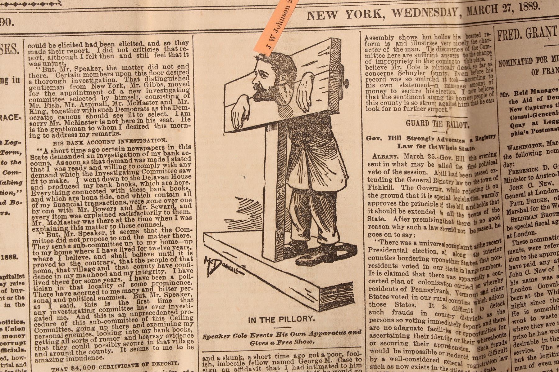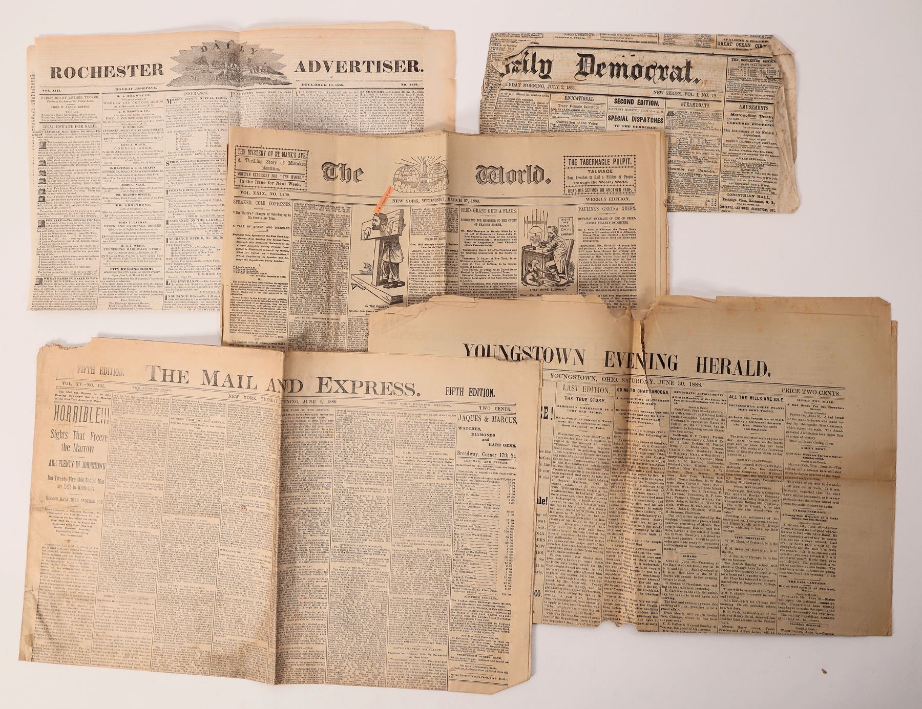 5 New York newspapers, either complete or a section. December 10, 1838 Rochester Advertiser, 2pp, discusses Indian affairs and the militia defenses of the country etc. June 4, 1889, The Mail and Express, 6pp, front page headline of the horror in Johnstown, PA! A massive flood that killed nearly 2000. Upper corner issues. December 10, ???? Daily advertiser, 2pp, court of chancery notices-horizontal tape repair. March 27, 1889, The World, 12pp, Speaker Cole confesses, a Republican scandal, and Cole is portrayed in the pillory! July 2, 1864, Daily Democrat, 2pp, folded into quarters, Abraham Lincoln for president, steamer schedule notices etc. Some have foxing and condition issues consistent with age.