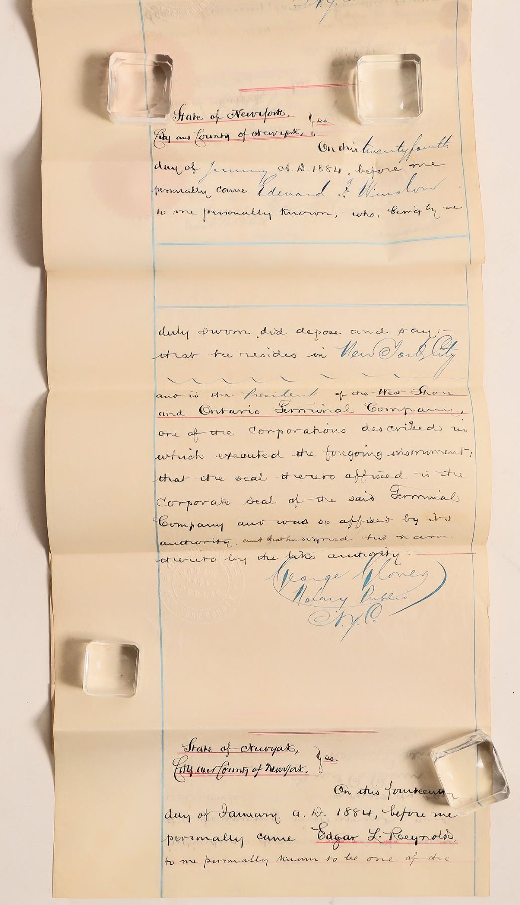 Legal document (Consent Decree?), handwritten, in 1884 for the New York, Ontario and Western Railway . The document is eight pages (Four double sided pages). In very nice condition for its age. Please see photos for more details.[ New York New York