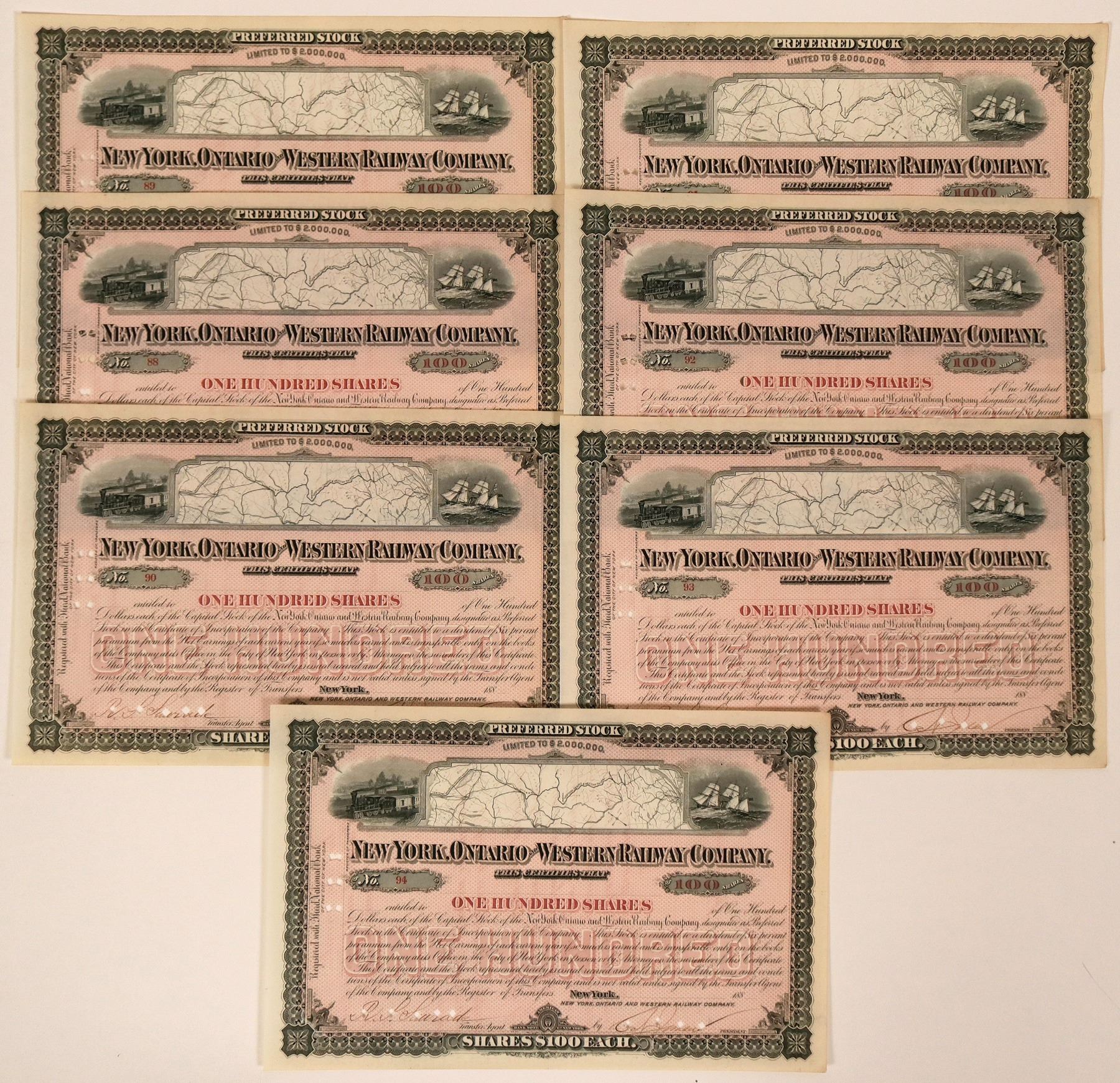 7 certificates. #88-94, U/C, signed by president. Black w/pink underprint. 100 shares, vignette map w/train and ship on either side, ONE HUNDRED pink underprint. American Bank Note Co. EF