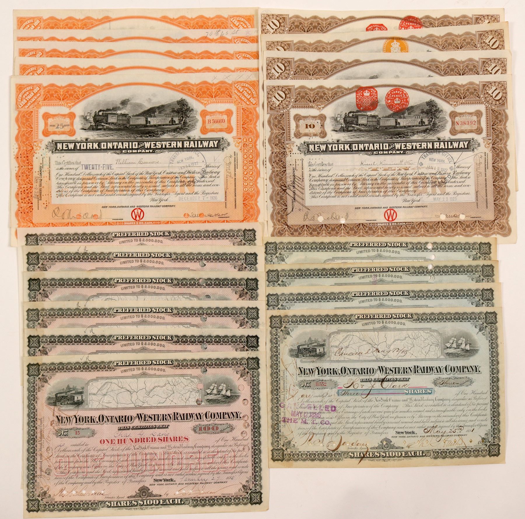 Cancelled 20 stock certificates for New York, Ontario and Western Railway Co. $100 each. 10 have vignette of train on tracks, other 10 have map surrounded by train on one side and ship on other. Border of orange, brown or gray. All except 1 assigned. Signed by president and treasurer (or assistant treasurer) (or transfer agent and vice-president). Printed: American Bank Note Co., NY. The New York, Ontario and Western Railway was a regional railroad beginning in 1868 and ran until its liquidation on March 29, 1957 by a US bankruptcy judge.