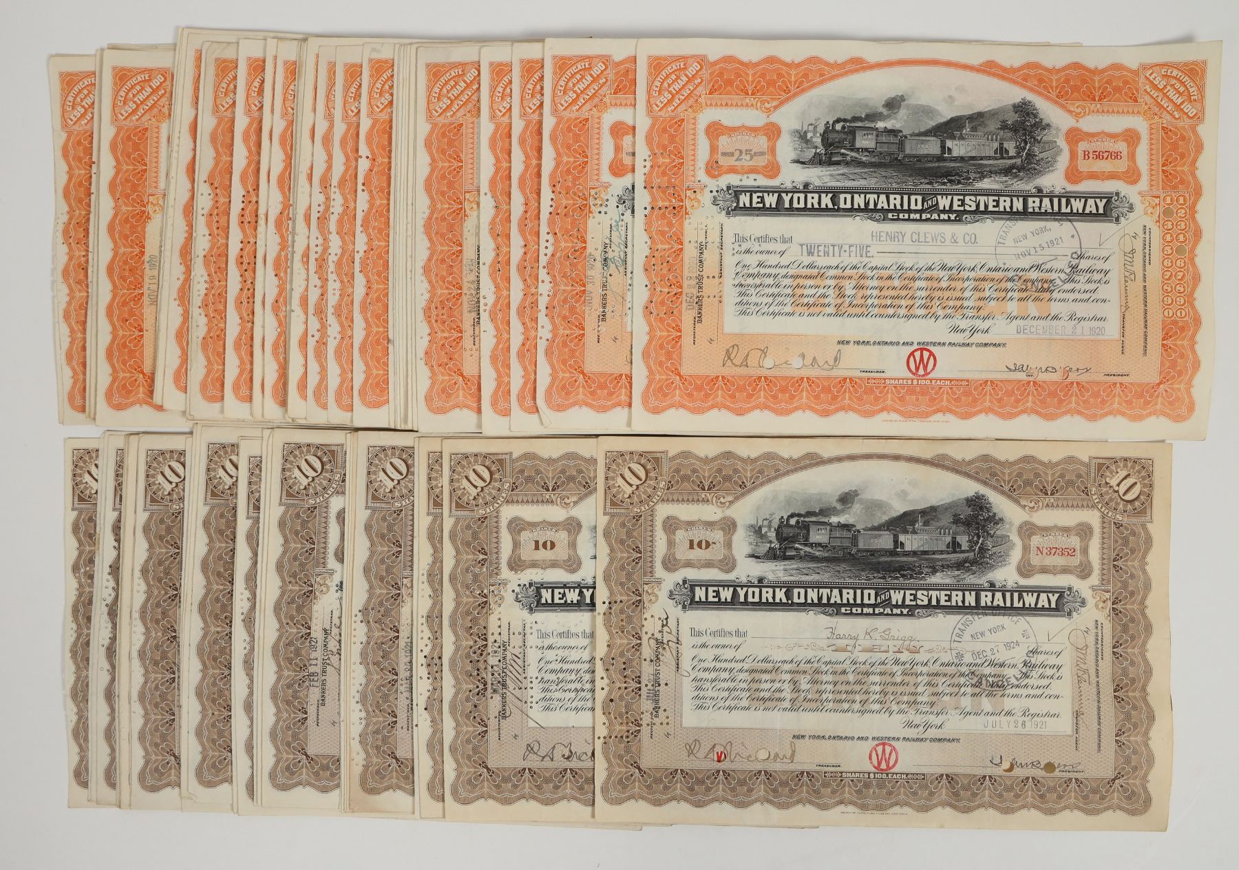 About 160 New York, Ontario and Western Railway Co. Stocks with orange borders (75%) or brown borders (25%) issued in the 1920s, cancelled mostly with N.Y. Transfer Office hand stamps and additional information (signatures, endorsements, stamps, separate receipts and/or revenue stamps) on reverse. The railway began in 1868 primarily transporting coal and dairy between upstate NY and the New Jersey region but financially struggled during it's years of operation taking on nicknames such as "Old and Weary", until the company bankrupted in 1937. See Photos. Great dealer lot.