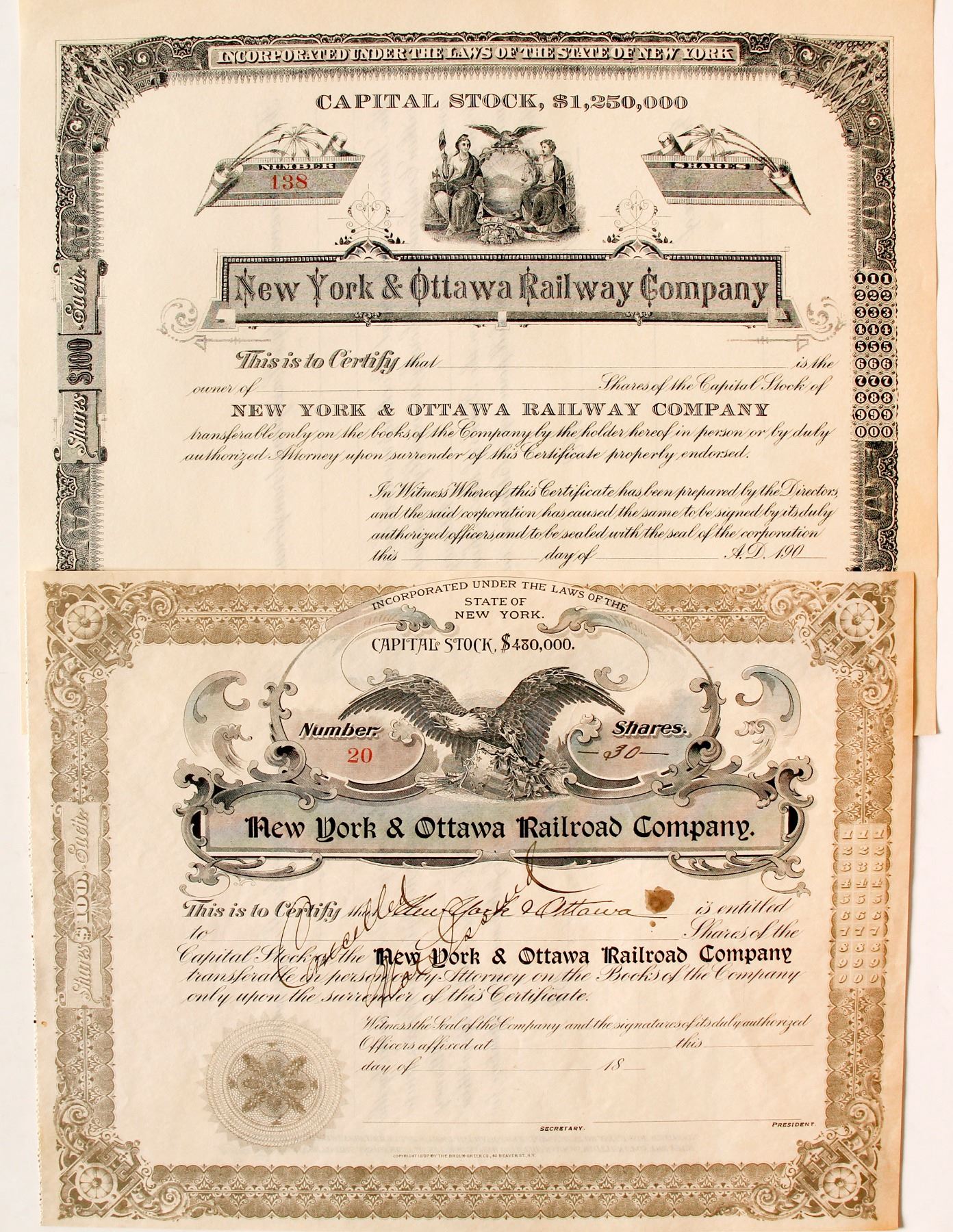 incorp. July 22, 1897. U/U #138 vignette eagle above union shield, , printed 190_ and I/C # 20 for 30 shares vignette eagle above state seal, receipt attached, handwritten cancelled, 18__ printed, black, The Brown-Green Co printer. Ef+ Ken Prag Collection