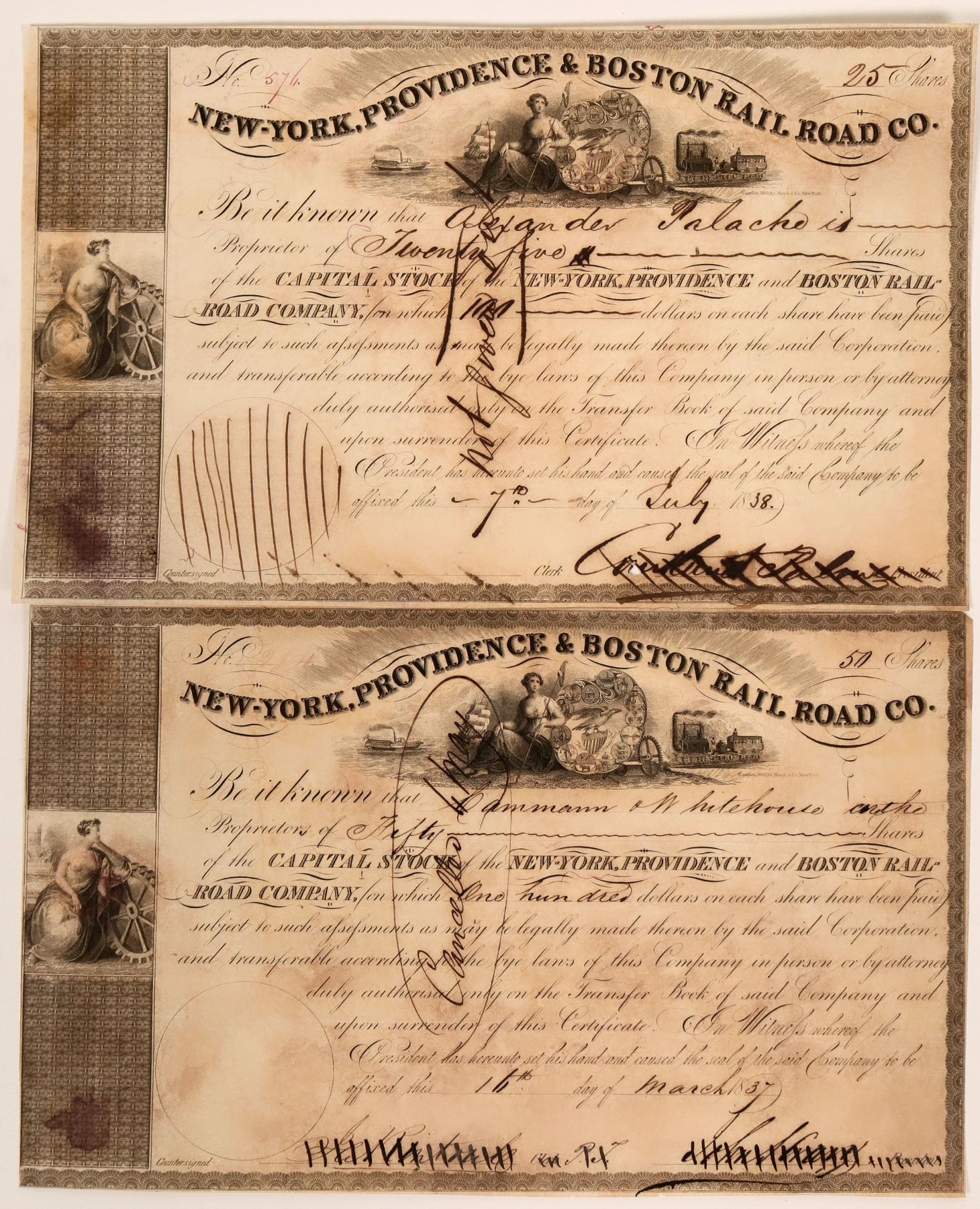 2 certificates. I/C, $100 shares, issued 1837-38, signed by president. Black, embossed seal, vignettes: top seated bare breasted female on shield, left bare breasted female leaning on gear. Unknown printer. VF