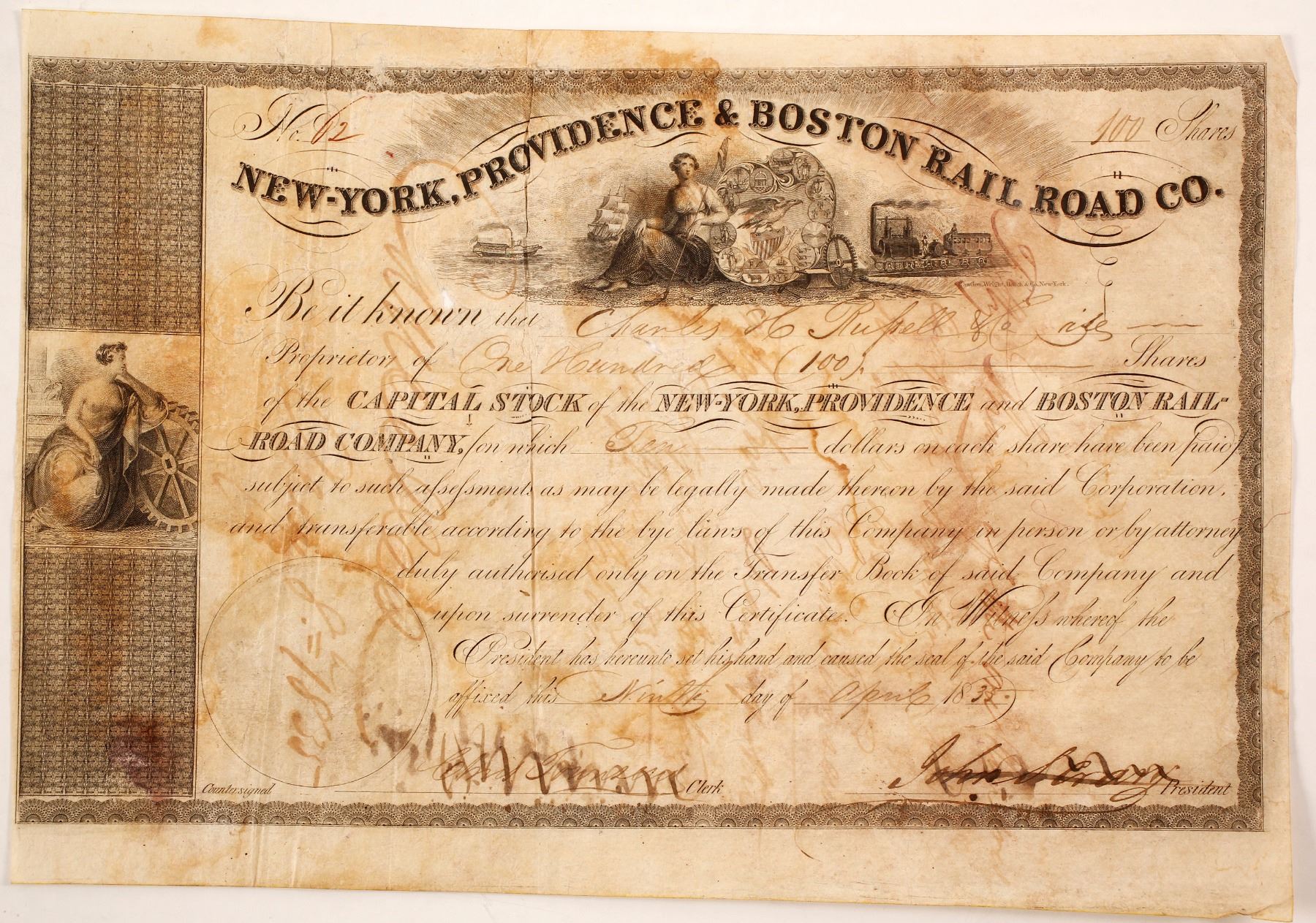 New York, Providence and Boston Railroad Co. # 12 for 100 shares @ $10 par, issued April 10, 1838 signature not legible, black border, left side vignette topless female sitting, top state seal w/ ships and loco background, embossed seal, plastic holder, unknown printer, Ken Prag Collection