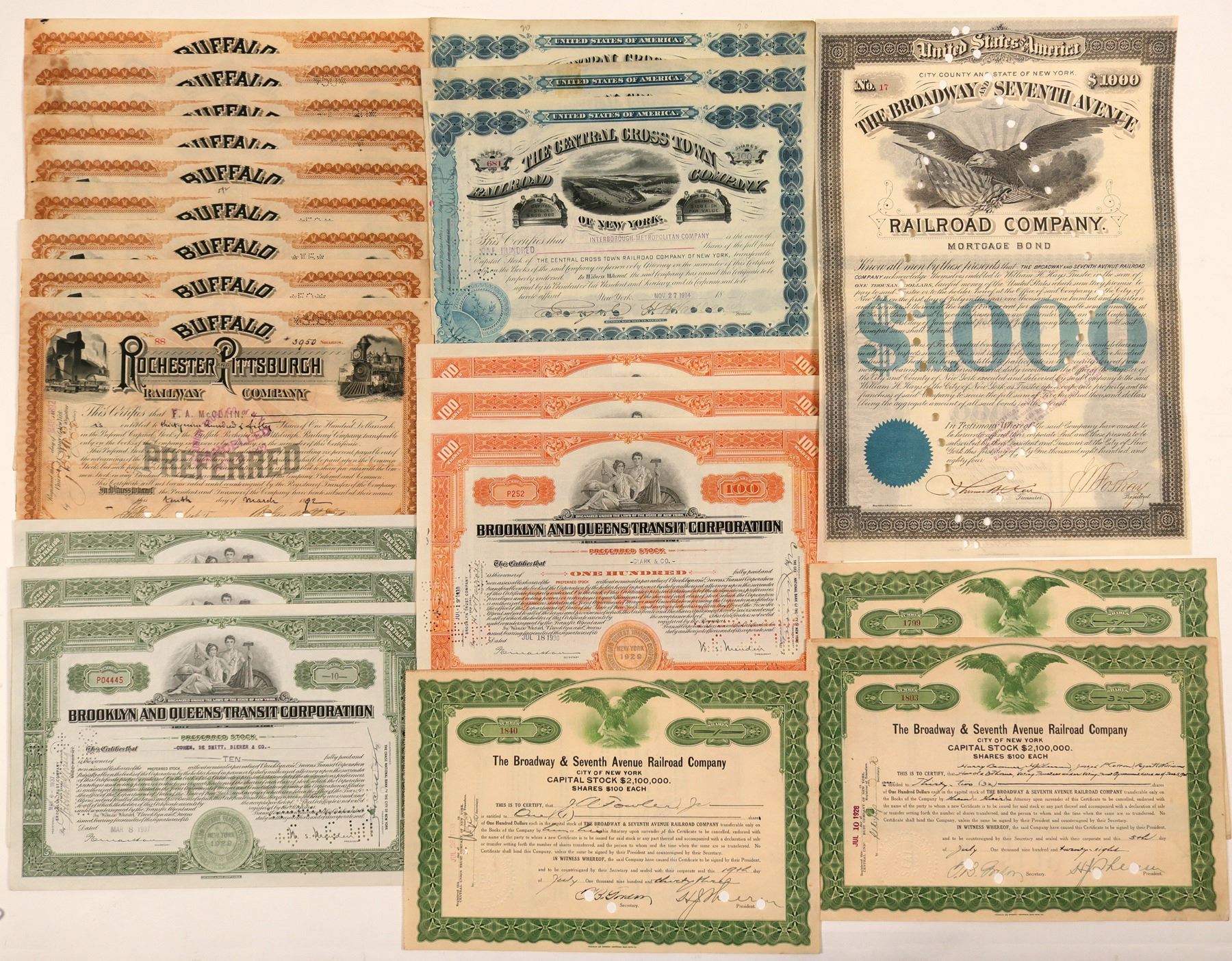Lot of 22. Included: Buffalo, Rochester & Pittsburgh Railway Company (9 issued in 1892); Broadway & Seventh Avenue Railroad Company (3 stocks and one bond, 1884-1938); Brooklyn & Queens Transit Corporation (6, two varieties, 1930-1937); and the Central Cross Town Railroad Company (3 issued 1897-1914). Please inspect. Most pictorial. Ken Prag Collection