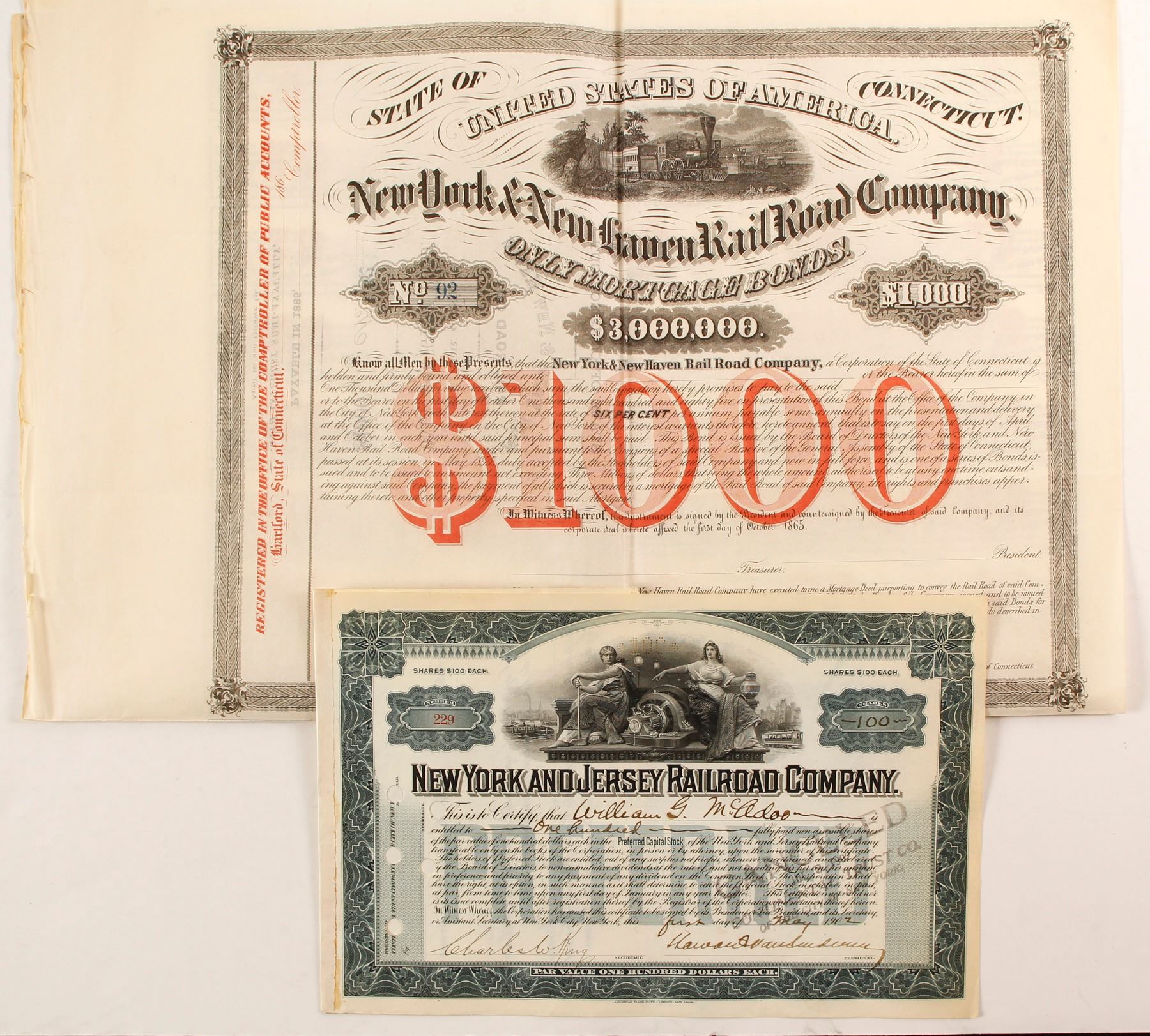 1. The New York & Mahopac Railroad Co. U/U red print on white paper, share @ $100 par, no vignette, unknown printer. 2. New York and Jersey Railroad Co. I/C #229 for 100 shares @ $100 par. issued May 1, 1902, green w/"PREFERRED" green underprint, receipt attached, vignette allegorical females sitting on generator, American Bank Note CO printer. 3. New York and New Haven Railroad Co. State of Connecticut incorp 1865. U/U #92 $1000 , 6% only mortgage bearer bond, black, "$1000" red underprint, vignette train l-r passing dock, coupons attached , E.B. Clayton's Sons printer. EF+ Ken Prag Collection