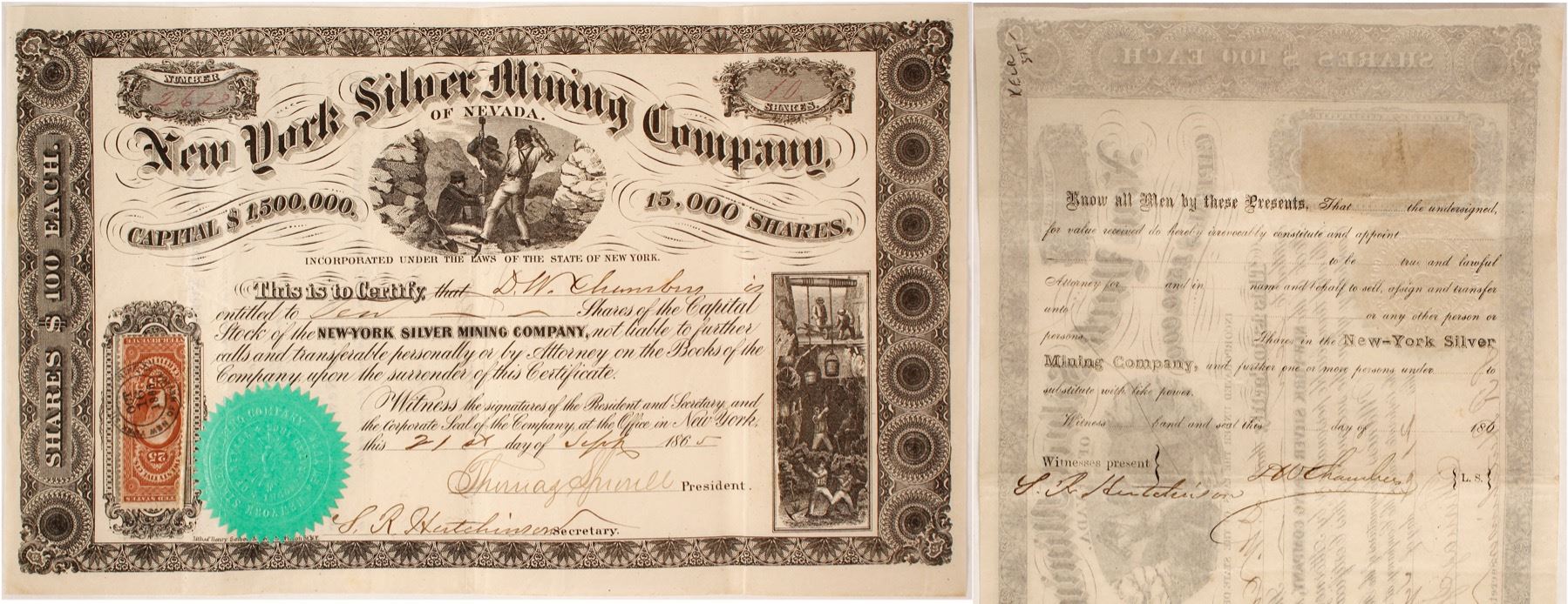 Inc. in New York. No. 262. Issued for 10 shares to D.W. Chambers on September 21st, 1865. Signed by Thomas Sproull as president and S.R. Hutchinson as secretary. Not cancelled. Unusual vignette at top center showing three miners working a drill into the surface. Second vignette at the bottom right showing miners lowering a windlass to other miners working underground. Printed by Henry Siebert & Bros. 25 cent revenue stamp attached lower left. Folds, very fine. This company is likely related to the New York & Austin SMC, the Plymouth SMC, and the New York & Boston SMC; all New York financed mines in Reese River at Austin. They leased the Troy Mine on Lander Hill in the gut of the district. It had a 500' deep shaft in 1869. They produced 26 tons of ore with a yield of $6,500 between January and July, 1869. The mine produced $83,000 through 1877. Not listed in Abbe, Brown, or Ross. [Ref: Raymond 1870]. Thomas Sproull was a theological professor, editor of the Reformed Presbyterian, and was well respected. His business interests clearly turned to mining but it is doubtful he would have made it out to Nevada. His name would have helped attract money to the company. City: Lander County State: Nevada Date: 1865