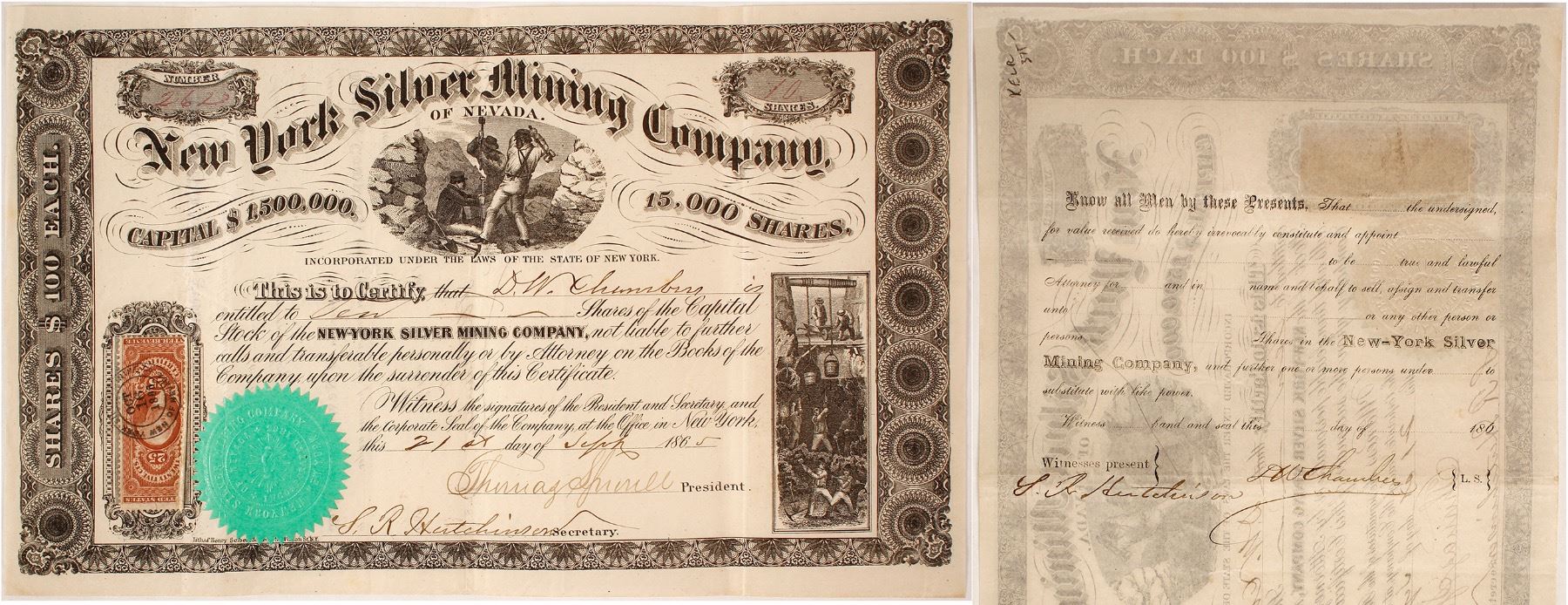 Inc. in New York. No. 262. Issued for 10 shares to D.W. Chambers on September 21st, 1865. Signed by Thomas Sproull as president and S.R. Hutchinson as secretary. Not cancelled. Unusual vignette at top center showing three miners working a drill into the surface. Second vignette at the bottom right showing miners lowering a windlass to other miners working underground. Printed by Henry Siebert & Bros. 25 cent revenue stamp attached lower left. Folds, very fine. This company is likely related to the New York & Austin SMC, the Plymouth SMC, and the New York & Boston SMC; all New York financed mines in Reese River at Austin. They leased the Troy Mine on Lander Hill in the gut of the district. It had a 500' deep shaft in 1869. They produced 26 tons of ore with a yield of $6,500 between January and July, 1869. The mine produced $83,000 through 1877. Not listed in Abbe, Brown, or Ross. [Ref: Raymond 1870]. Thomas Sproull (1803-1892) was a theological professor, editor of the Reformed Presbyterian, and was well respected. His business interests clearly turned to mining but it is doubtful he would have made it out to Nevada. His name would have helped attract money to the company. Date: Location: Lander County, Nevada HWAC# 60643