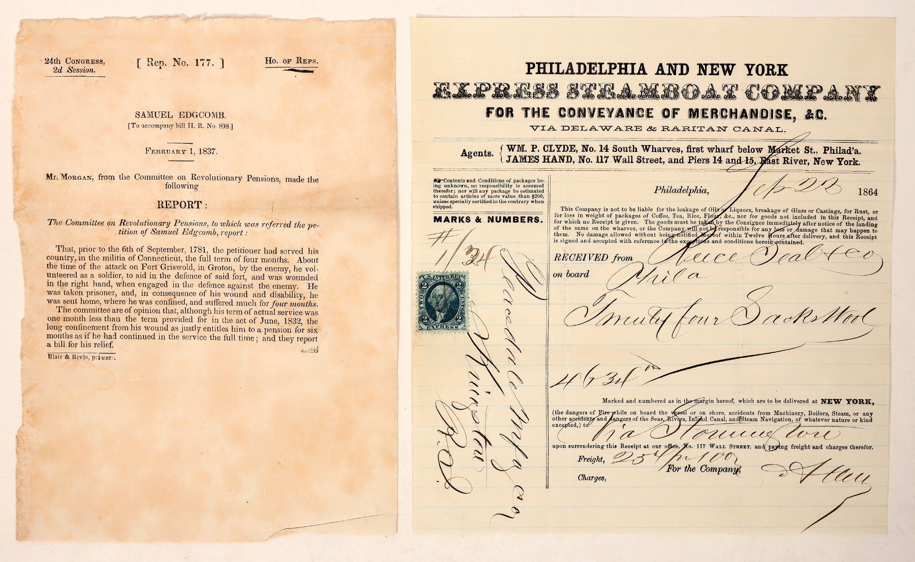 1864 receipt from Philadelphia and New York Express Steamboat Co. via Delaware & Raritan Canal, 24 sacks of wool. Also, 1837 report page related to Samuel Edgcomb Revolutionary pensions-foxing.