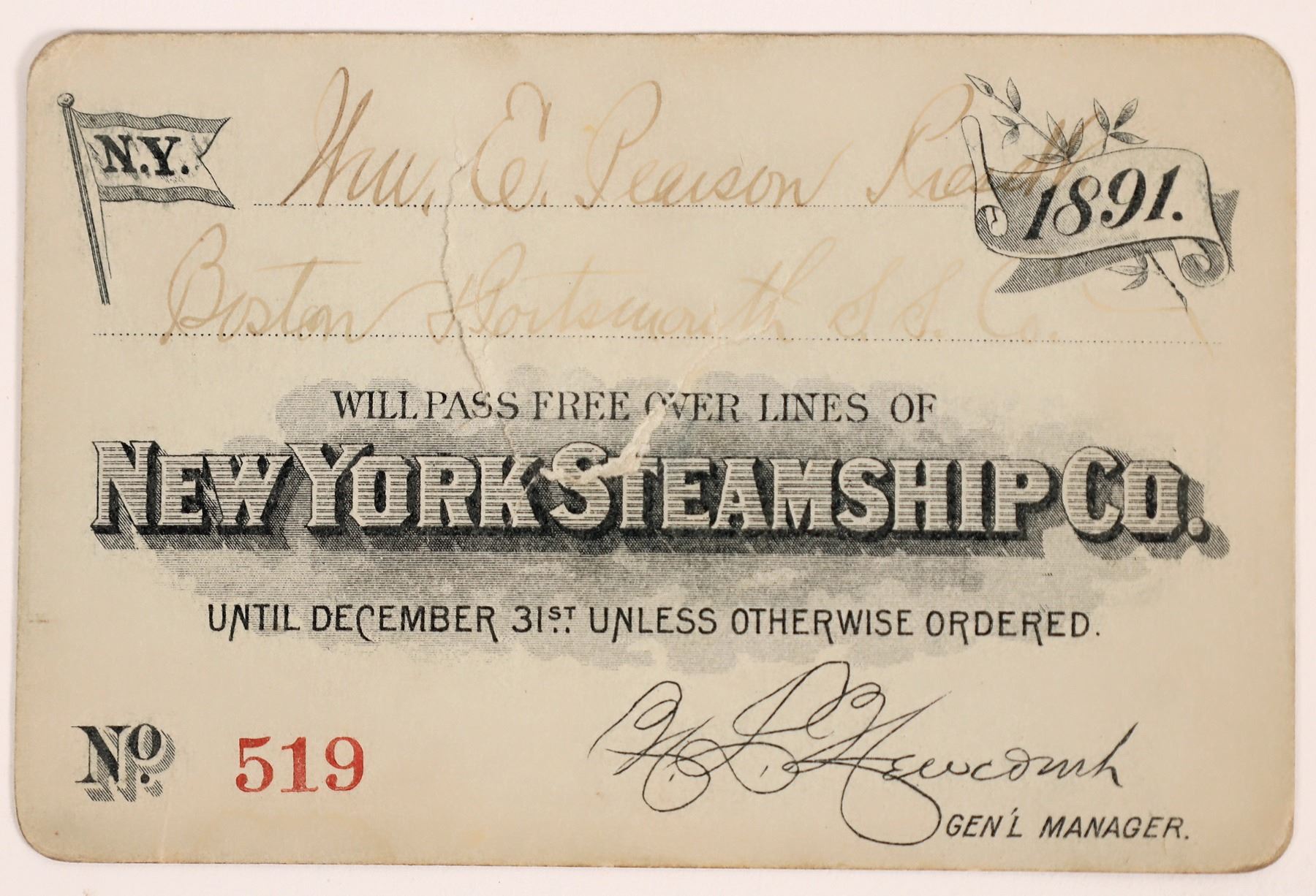 Pass no. 519, issued for 1891 to William E. Pearson, president of the Boston & Portsmouth Steamship Company. Preprinted signature of the general manager Newcomb. Small flag vignette and logo in the clouds design on cardstock. Pass appears to have been punched through the center to cancel. Other light wear. Please inspect. Boats operated between New York and St. John, New Brunswick; Yarmouth, Nova Scotia; Eastport, Maine; and Cottage City, Maryland.