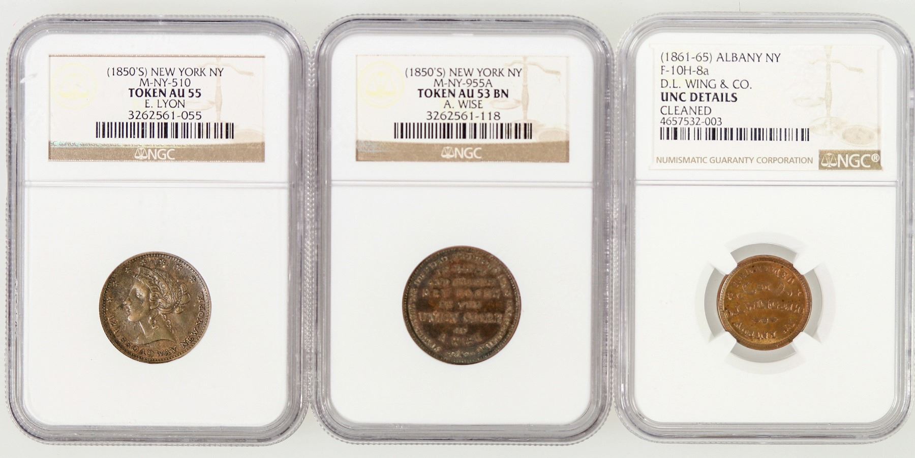 Three NGC certified store cards: 1) A. Wise, New York AU 53 BN; 2) E. Lyon, New York AU 55; 3) D. L. Wing & Co., Albany; Unc details, cleaned.