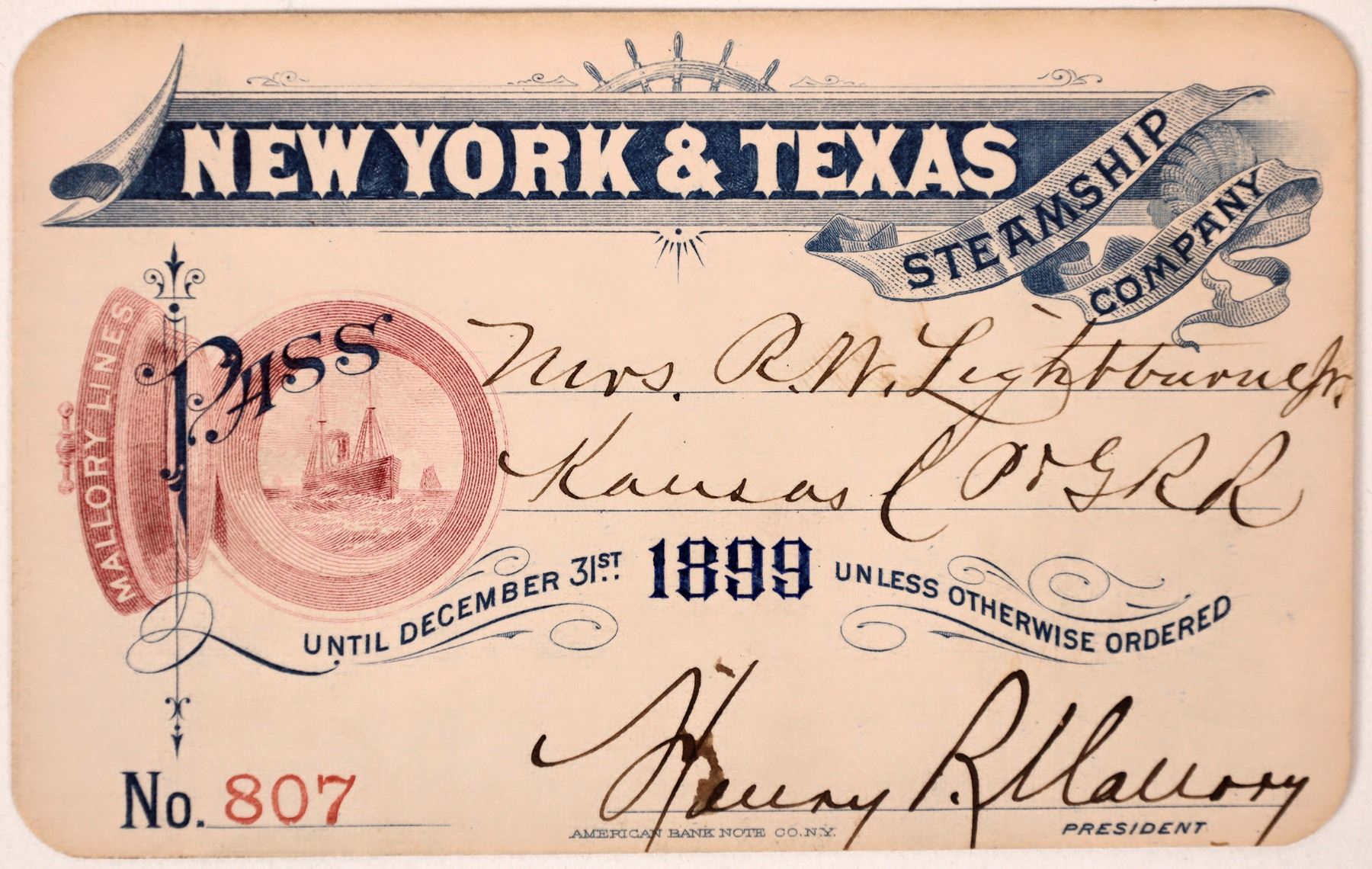"Mallory Lines." Great looking pass no. 807, issued for 1899 to Mrs. RW Lightburugh. Signed by president Henry R. Mallory. Blue and red print on cardstock, printed by American Banknote Co. Pictorial logo and porthole vignette showing steamship. Formed by Galveston merchants and capitalists who wanted a regular steamship line to be established between Galveston and the Eastern Seaboard.