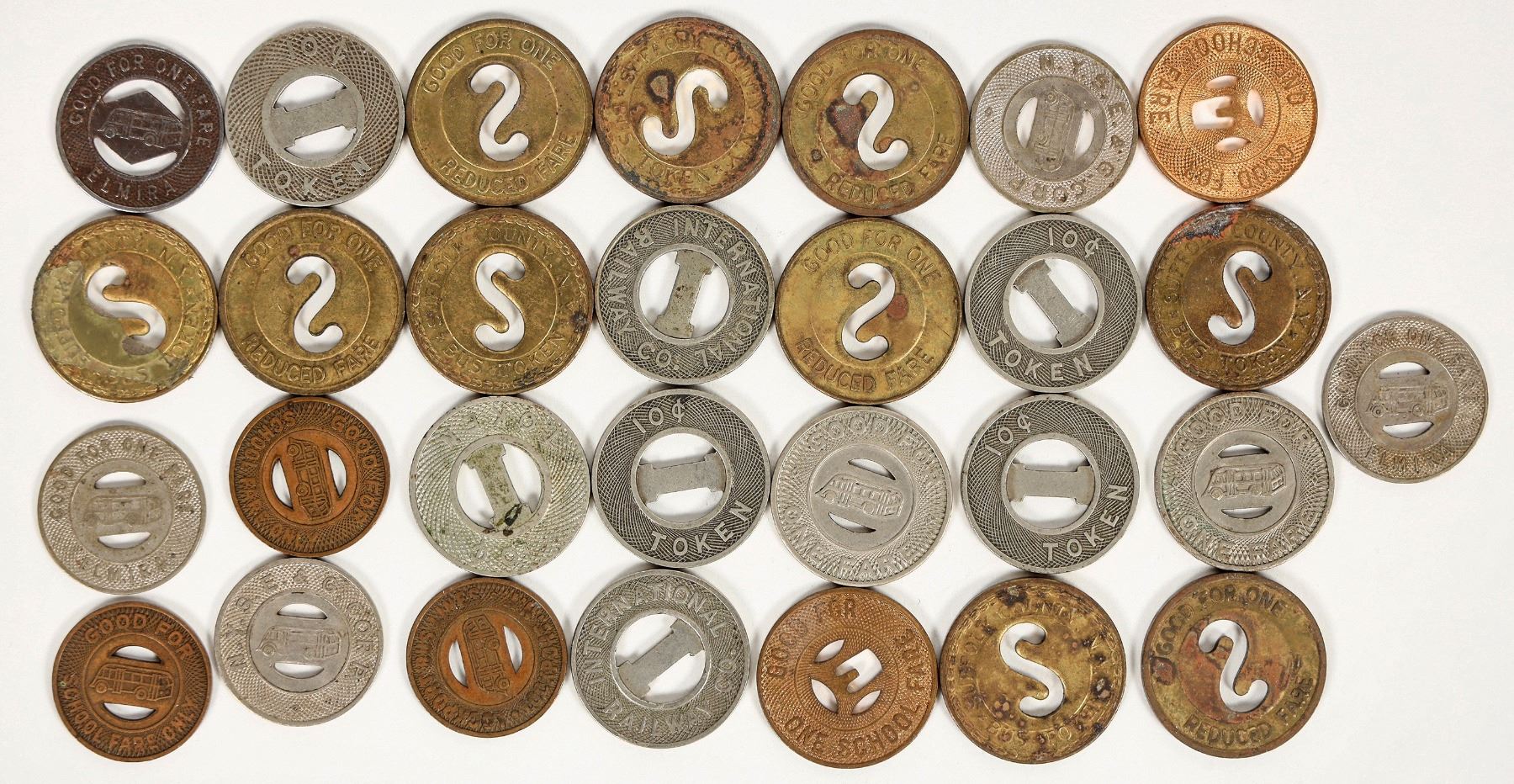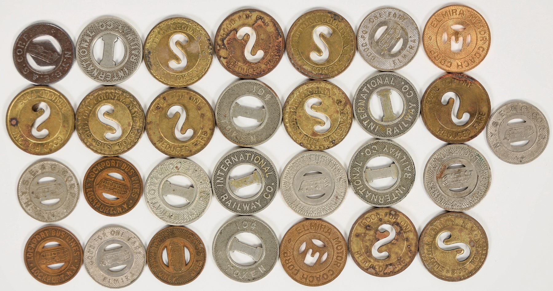 Lot of 29 transportation tokens: Lockport Bus Lines; International Railway Co.; Suffolk County Bus Tokens; Elmira Motor Coach Corp.