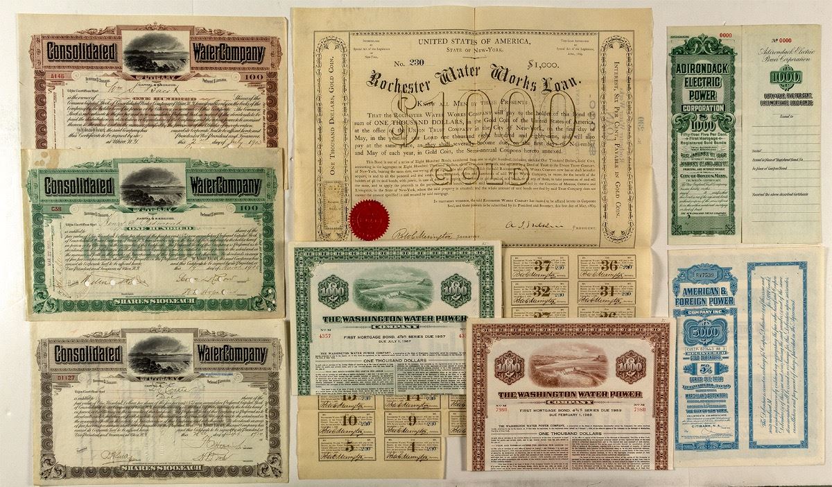 Lot of eight. Bonds: Rochester Water Works ($1,000, 1869, not cancelled, 37 coupons attached, red seal, no vignette), specimen $1,000 bond for Adirondack Electric Power Corp. (1912, punch cancelled, nice vignettes), Washington Water Power Co. ($1,000, 1957 & 1959, both punch cancelled, green or brown border with vignette), and American & Foreign Power Company ($5,000, 1982, punch cancelled). Stocks: three different stocks for the Consolidated Water Company, same vignette, brown, grey or green border, issued 1900-1920, punch cancelled. (Prag Collection) City: State: New York Date: 1869-1982 hwac# 34365