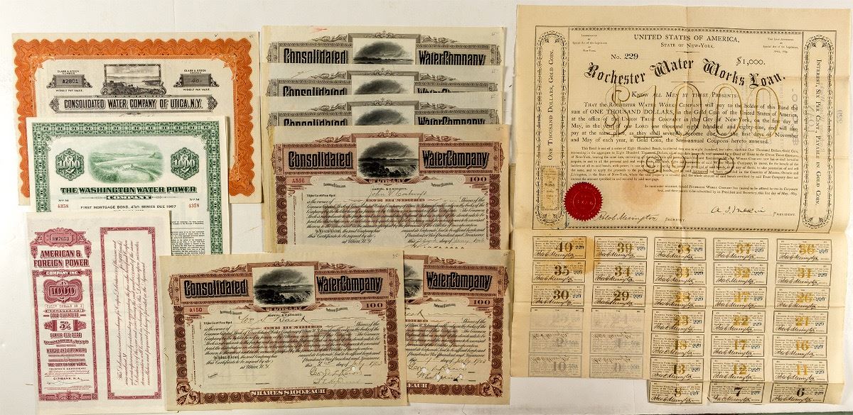 Lot of twelve. Stocks: very early certificate for The Washington Water Gas Company (1859, not cancelled) and seven certificates for the Consolidated Water Company of Utica (three types, issued 1903-1928, all punch cancelled, same vignette of dam, three different colored borders). Bonds: early $1,000 bond for Rochester Water Works (1869, not cancelled, 37 coupons), two different $1,000 bonds for The Washington Water Company (1957 & 1959, punch cancelled, dam vignette), and a 1981 bond for American & Foreign Power Company (punch cancelled). (Prag Collection) City: State: New York Date: 1859-1981 hwac# 34366