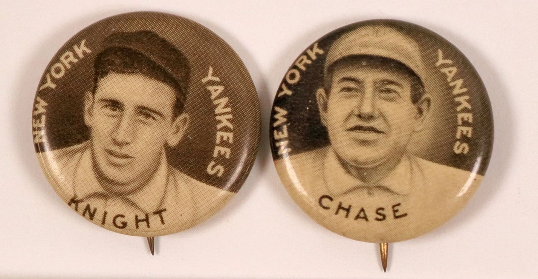 Lot of two Sweet Caporal pins (22 mm) featuring New York Yankees: Knight and Chase. Hal Chase had a 15 year major league career plagued by charges of corruption: betting on games and "laying down" so he never made the Hall of Fame. John Wesley Knight was an infielder in the major leagues from 1905-13.
