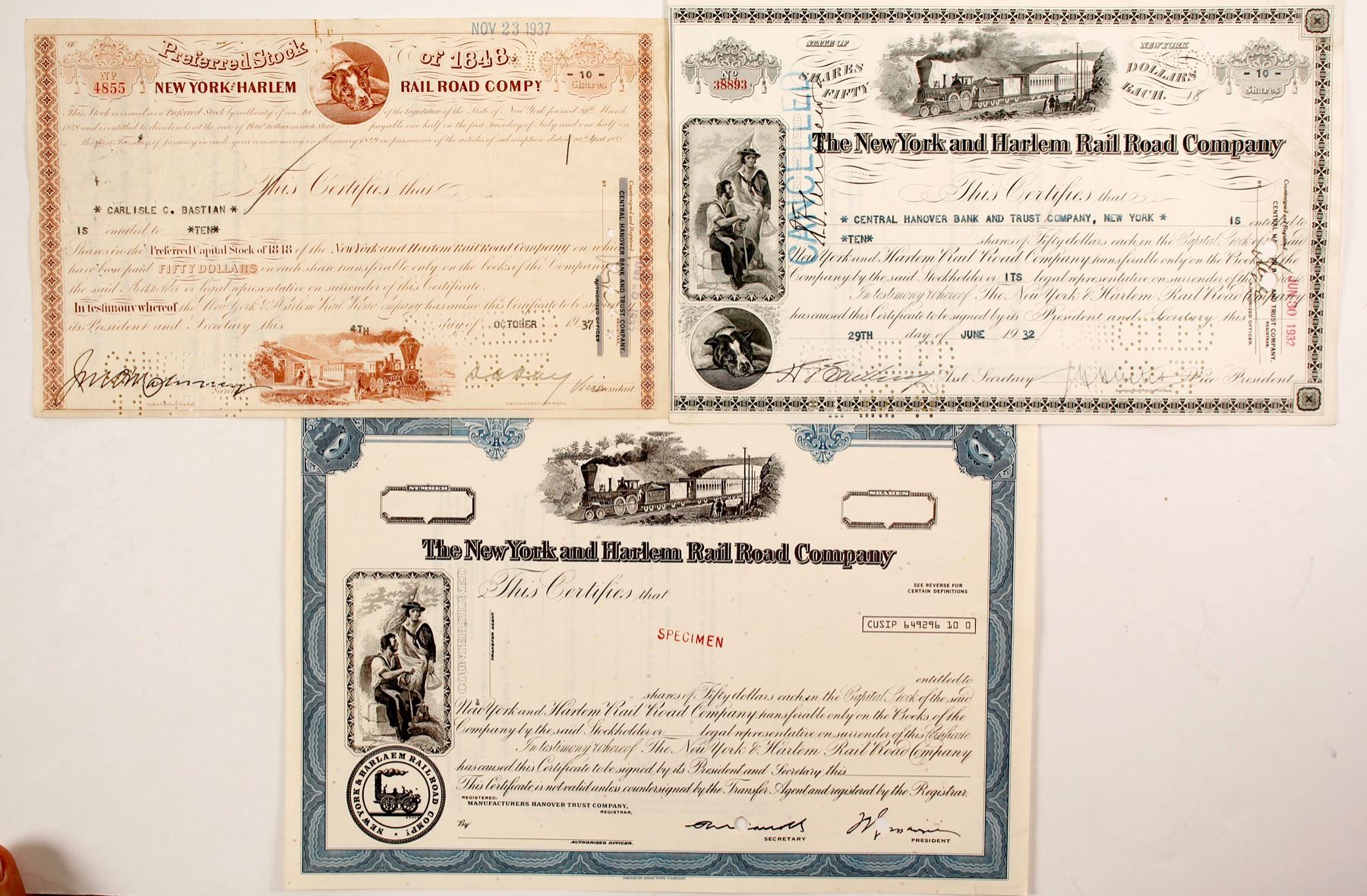 Incorporated State of New York. I/C #4855 for 10 shares of preferred stock of 1848 (title), issued Oct 4, 1937. Brown, vignette bottom train leaving station l-r, top center dog. Bald & Cousland printer. I/C #38893 for 10 shares @ $50 par, issued June 29, 1932, black, vignettes: top train passing under bridge, bottom left dog, upper left two men one seated, unknown printer.