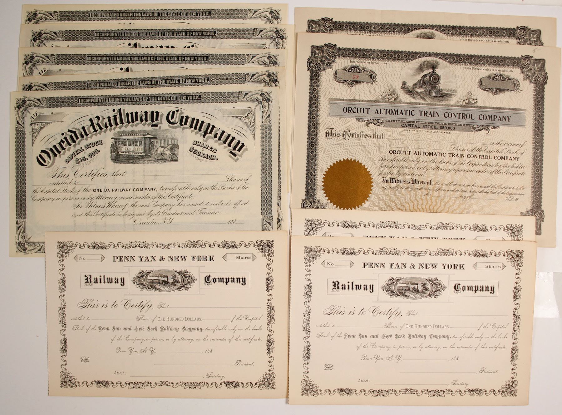 Lot of three different rail companies. Total of 10 shares, all but one are unissued. Orcutt Automatic Train Control Company, Oneida Railway Company, and Penn Yan & New York Railway Company. There are 2 Orcutt shares, each for $100. Datelined, The Common Wealth of Massachusetts. These two are in very good to condition, one has a fold on the right side of the share. There are five Oneida shares, each for $50. One is issued and cancelled and the others are all unissued. All in good condition. There are 3 Penn Yan & New York shares, each for $100; all unissued and in good condition. Prag Collection. City: State: Date: 1800's-1900's HWAC# 78737