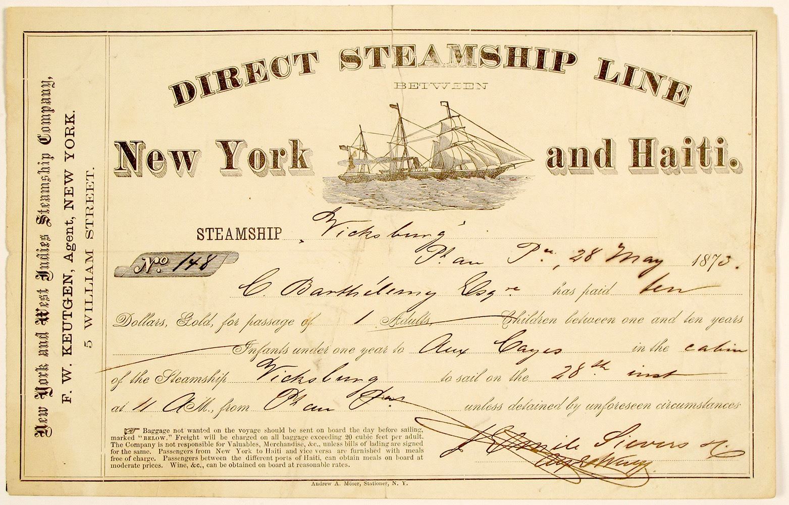 "Direct Steamship Line Between New York & Haiti." Pictorial receipt for passage on the Steamship Vicksburg, dated May 28, 1875. For passage to Aux Cayes. Printed by Andrew A. Moser, NY. 5.75" x 9.25" Folds, 2 inch tear. (Prag Collection) Date: Location: New York, New York HWAC # 54595