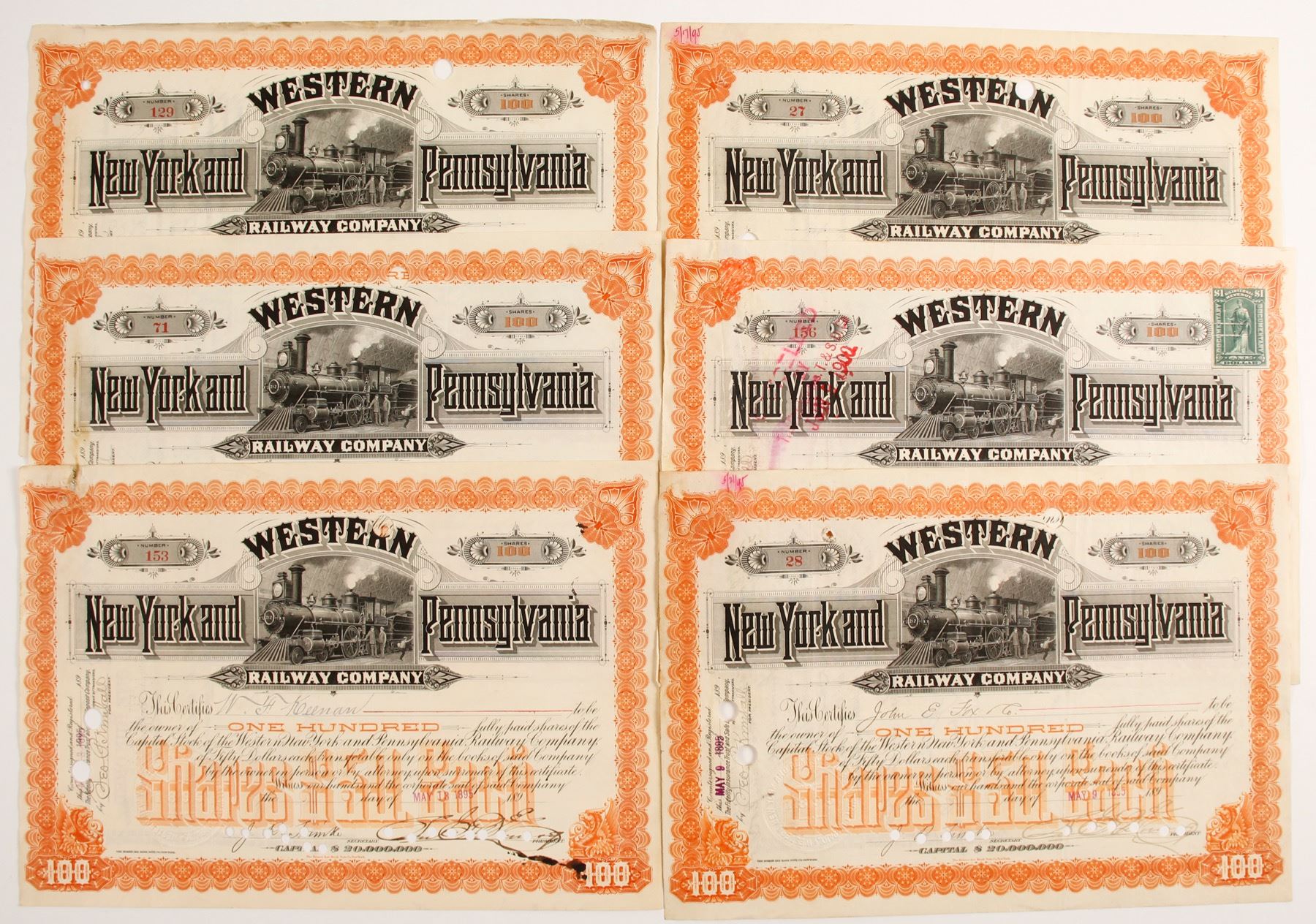 6 total certificates. All are signed and canceled; printed by The Homer Lee Bank Note Co., New York. All in good condition, some discoloration. Vignette of a steam train about to leave a station. Prag Collection. City: State: Date: 1890's HWAC# 78768