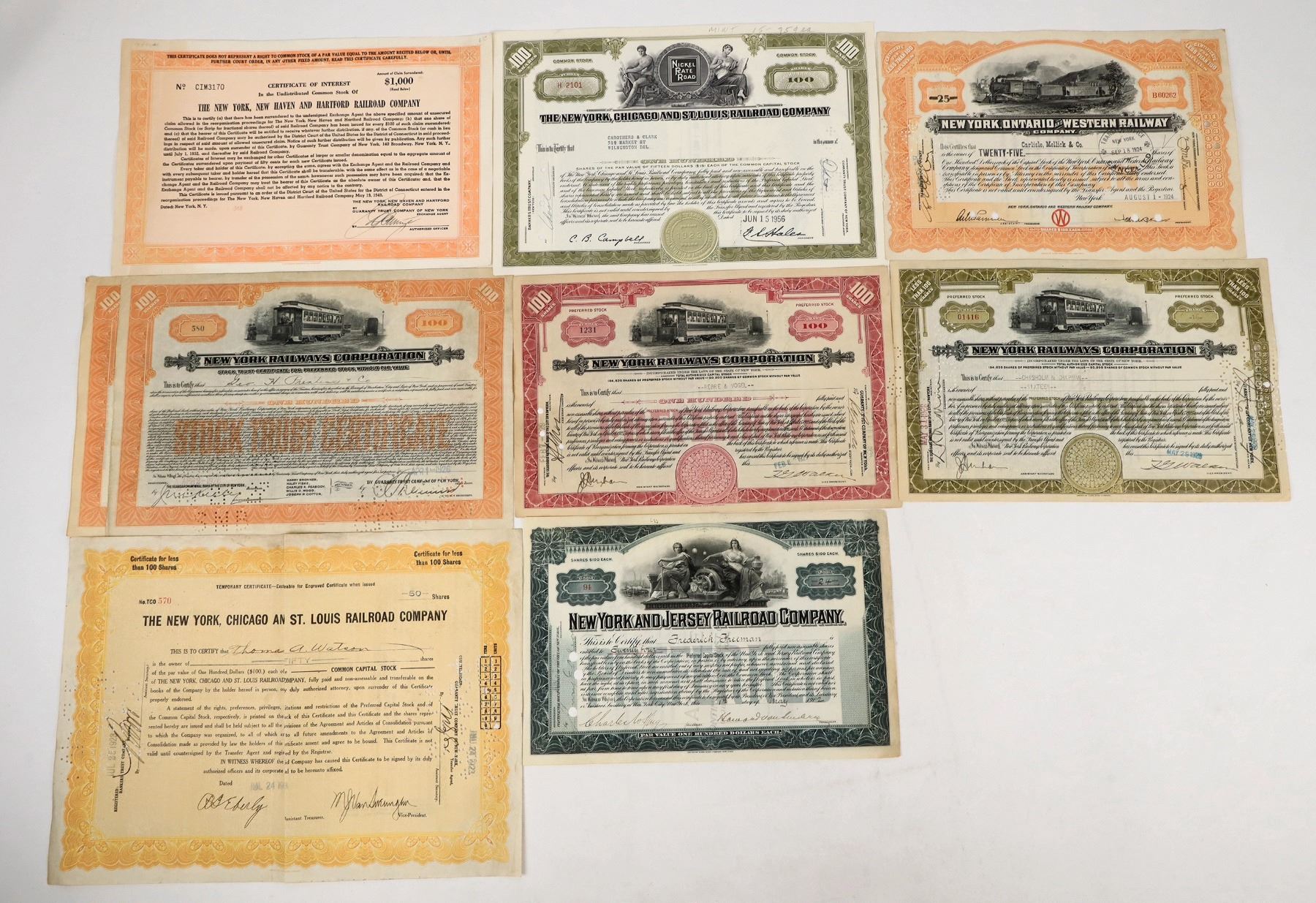 There are nine stocks from New York origin railroads: New York, New Haven and Hartford Railroad Co. stock issued 1948; New York Railways Corp. preferred stock 1926 (2), 1928, 1929; New York, Ontario and Western Railway Co. 1924; The New York, Chicago and St. Louis Railroad Co. 1923, 1956 (2); New York and Jersey Railroad Co. stock 1902. Please see photo for details.