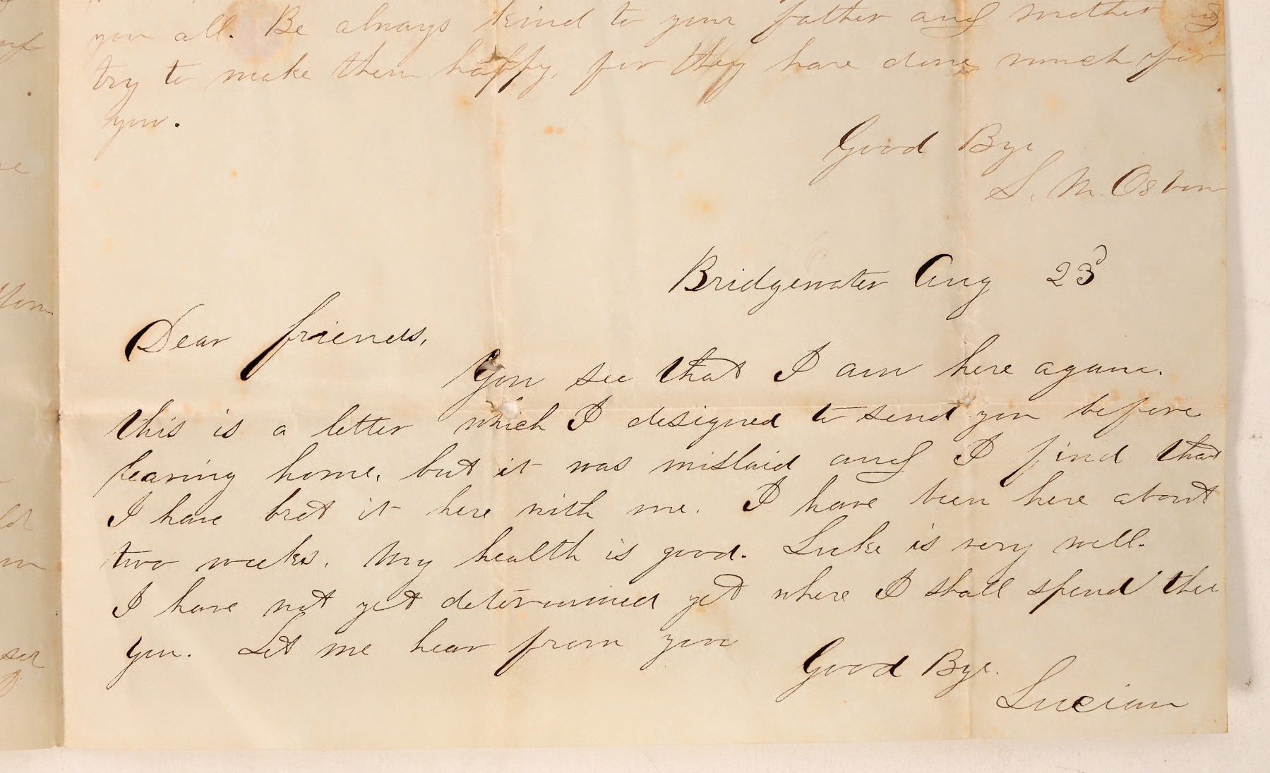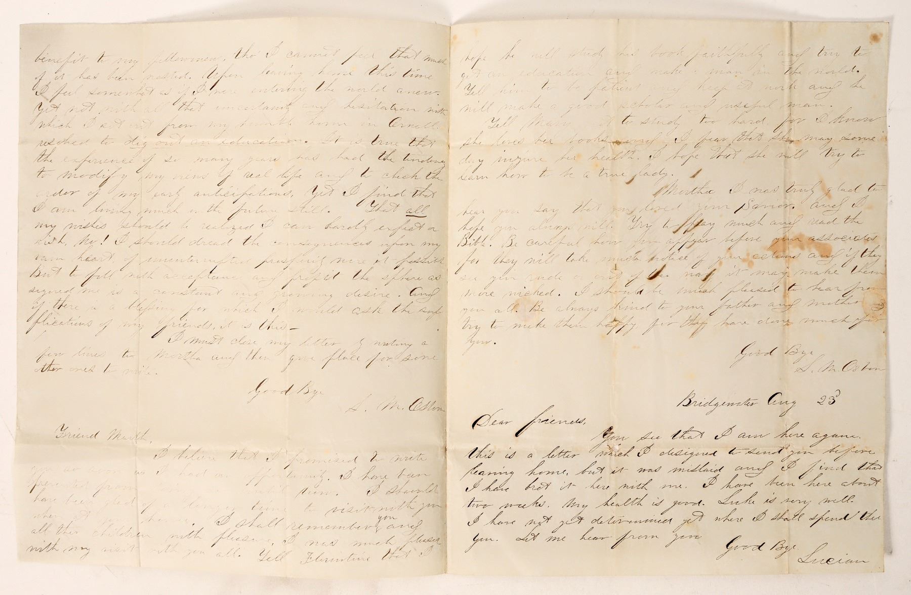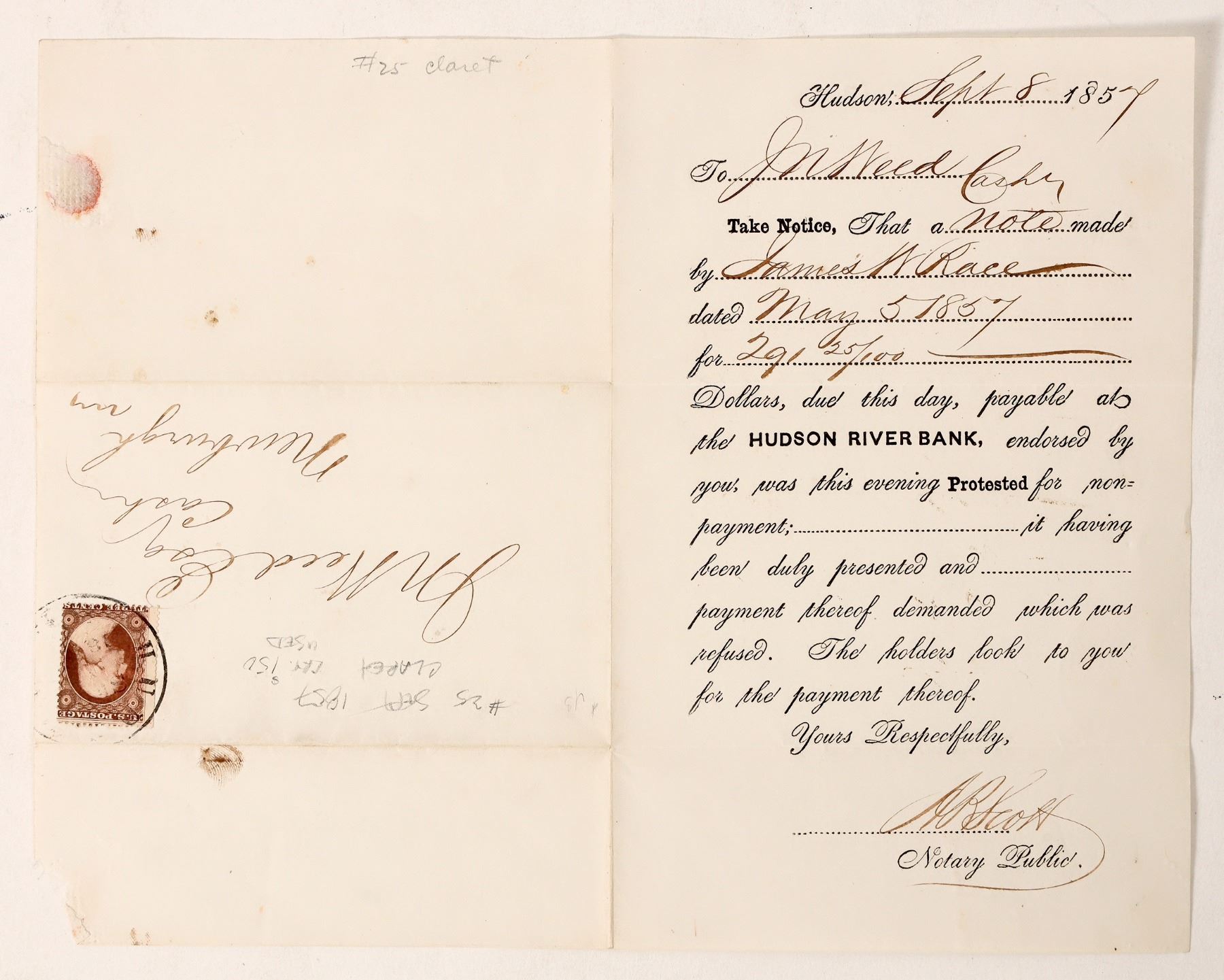 Two pieces of mail sent from New York to Ohio, one from Hudson, NY and one from Bridgewater, NY. The Hudson letter dates from 1857 and the Bridgewater letter from 1849. The Hudson letter is an official notice of unpaid debt; the Bridgewater letter is a personal message from one Lucien M. Osborn to his friends in Portage County, OH regarding his plans to move. [ New York