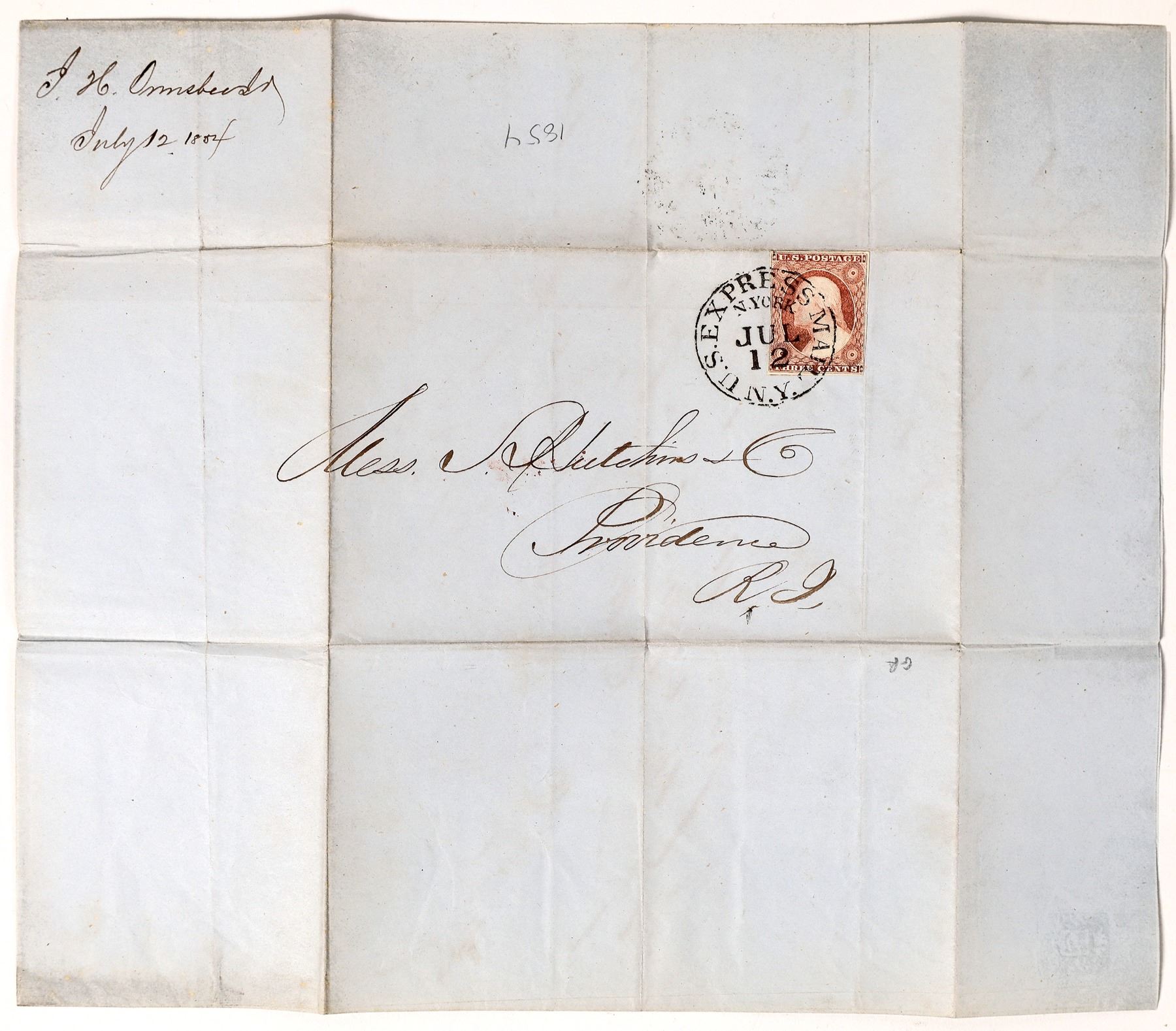 U. S. Express Mail New York to Providence Rhode Island postmarked July 12 1854. Concerning cotton prices.