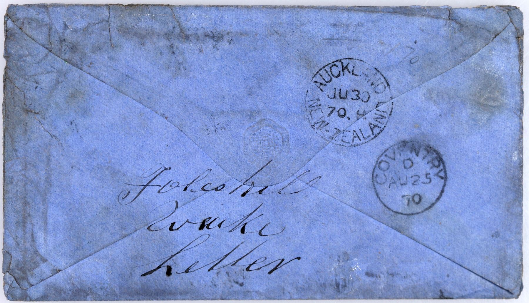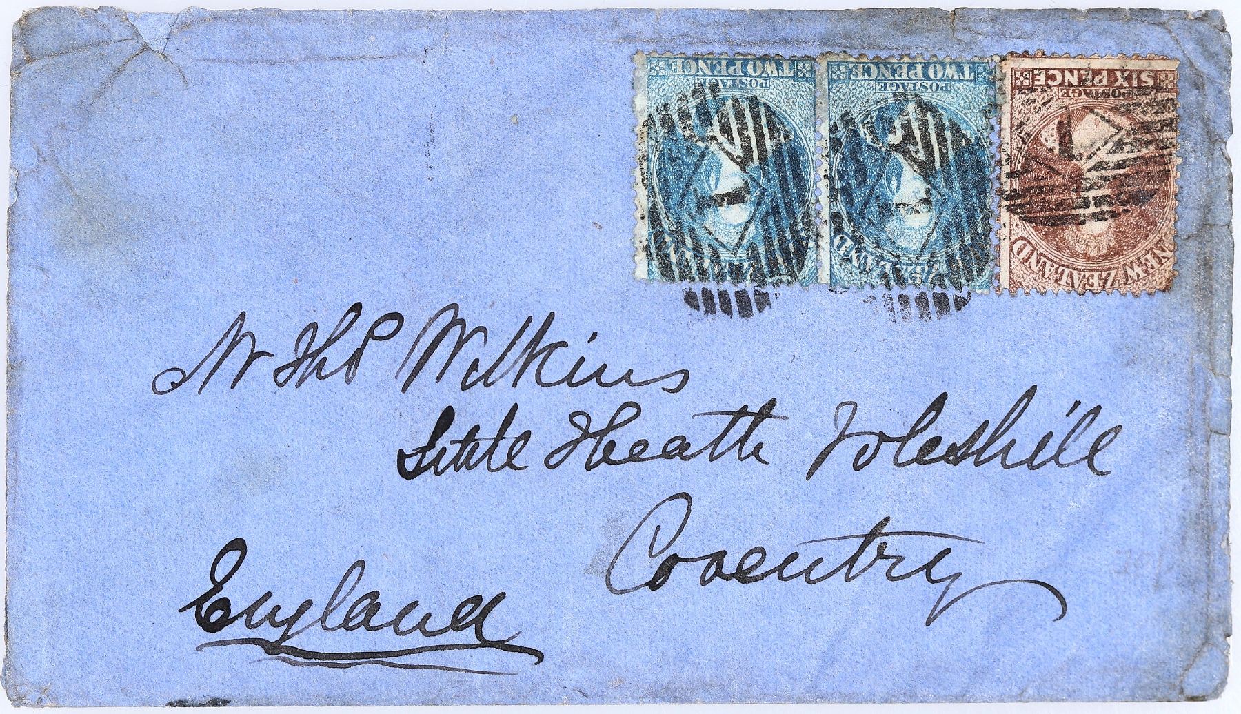New Zealand 1870 cover to England franked with 6p & 2p pair tied by "1"killers of Auckland, edge faults, colorful.
