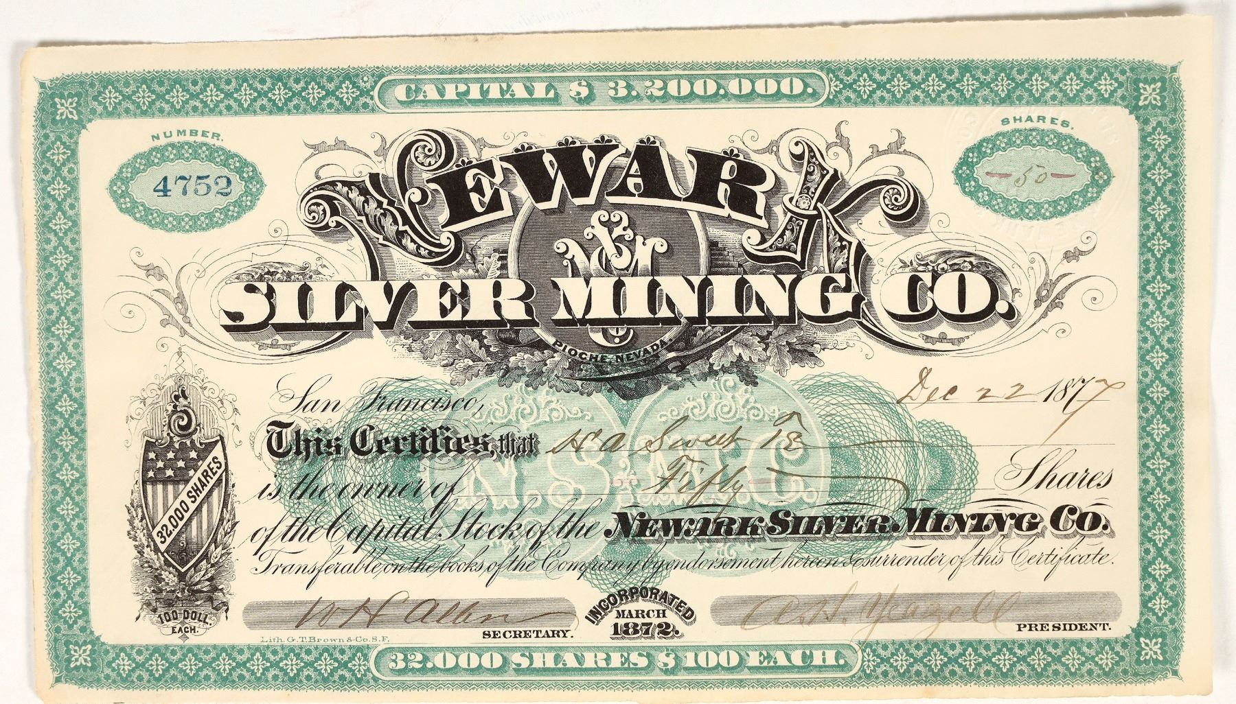 I/U. Newark Silver Mining Co. Stock issued 1877, Great design and attractive, Inc. Embossed seal. March 1872. G.T. Brown & Co. printer. Rare Newark Silver Mining Company Stock by African-American Lithographer, G. T. Brown. He designed the certificate in 1872. "The Newark Silver Mine, located near Pioche, Nevada, is situated within the Pioche Mining District, which has a rich historical significance in the mining industry. When it was operational, the mine had a relatively small production capacity. The ore body at the Newark Silver Mine is described as tabular shaped, although the exact dimensions are unknown. The surrounding geology in this area consists predominantly of quartzite, which is a type of metamorphic rock. The geomorphology of the surrounding area is characterized by the Great Basin, which is part of the Intermontane Plateaus region. The Great Basin is known for its unique landscape and diverse geological features." from the diggings.com