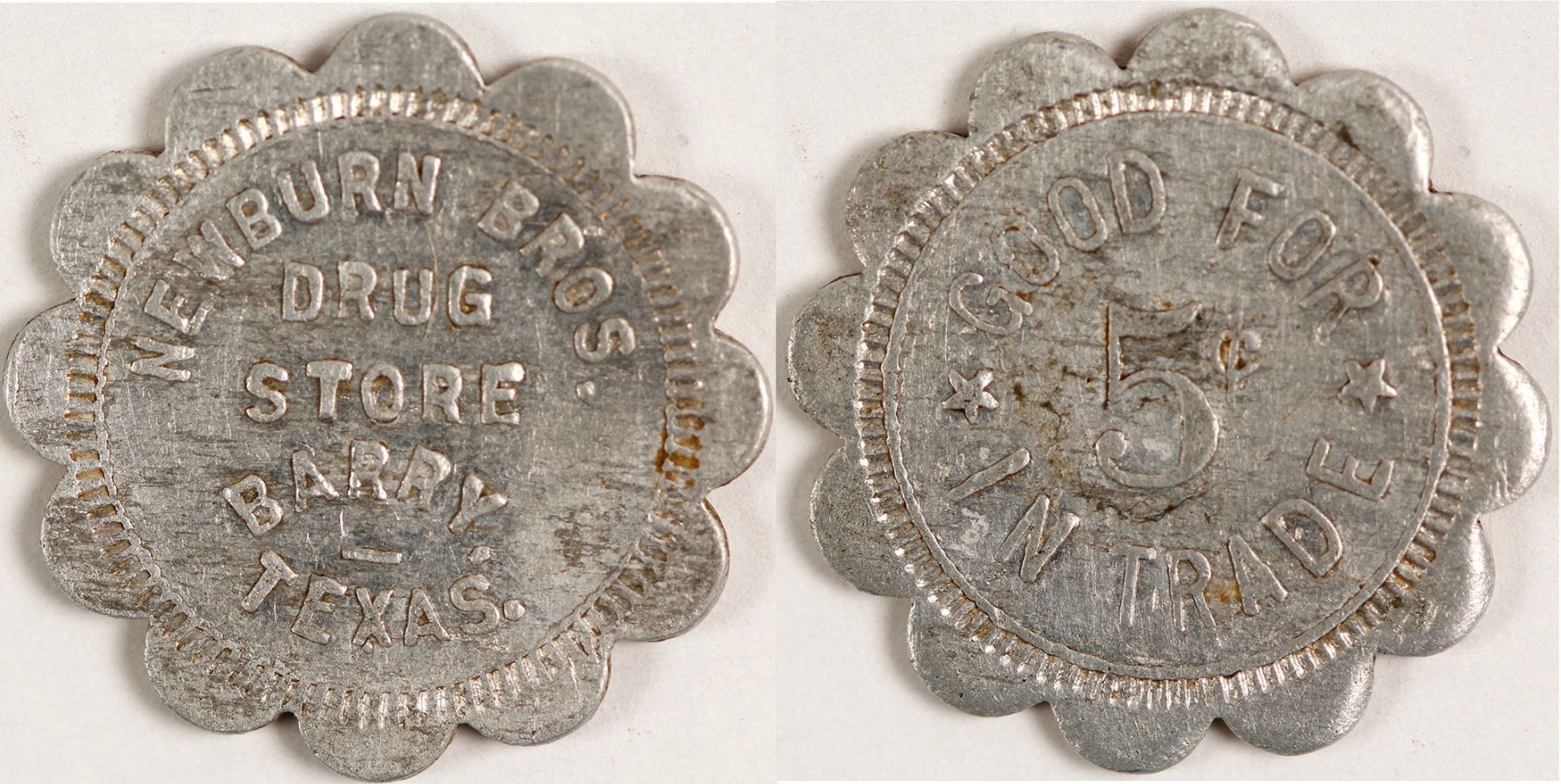 Aluminum 12 scallop from a 2 token town. 22mm. NEWBURN BROS. / DRUG STORE/ BARRY, TEXAS. // GF / 5C/ IT HWAC# 62517 Date: Location: Barry, Texas