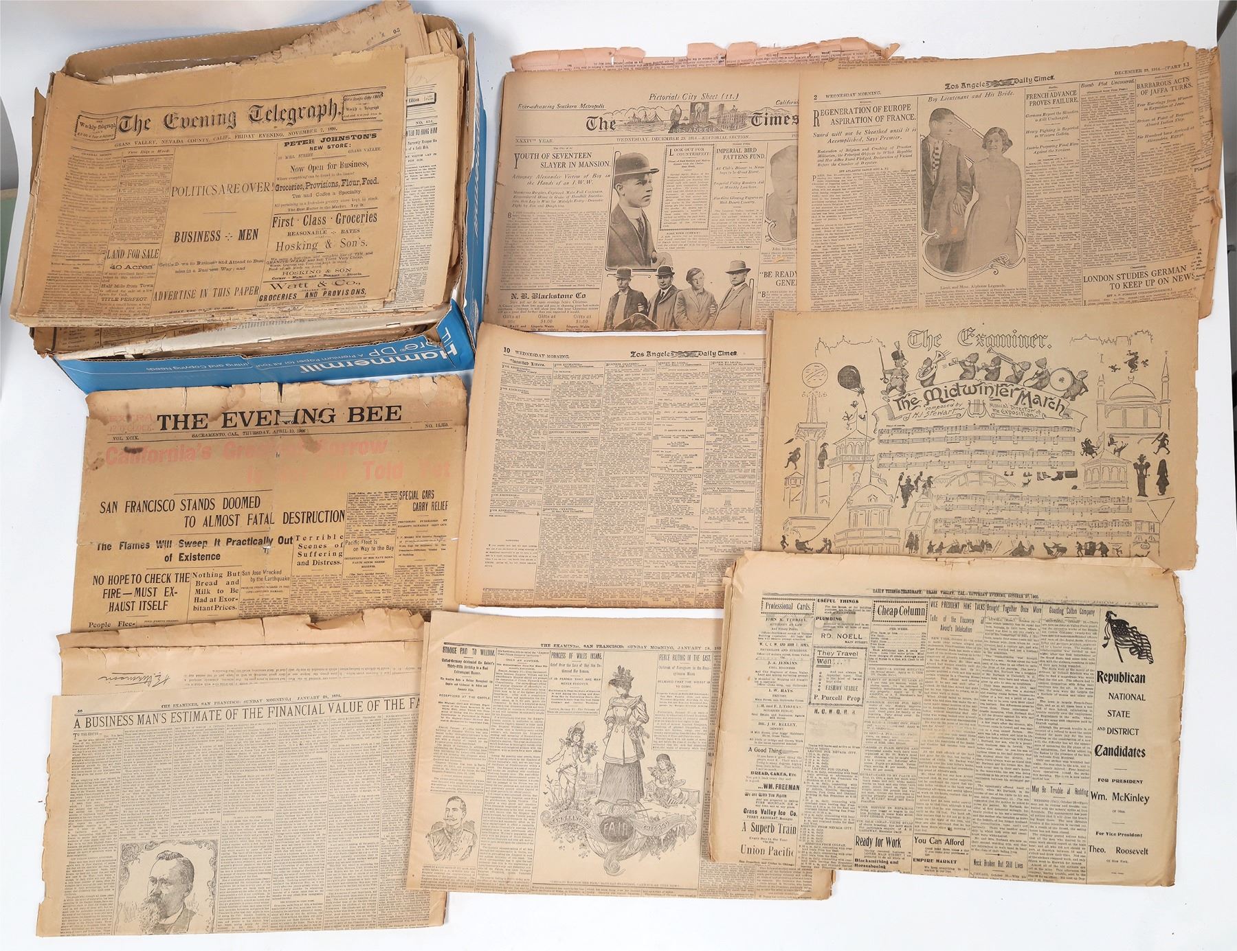General Advertiser 1808, Philadelphia. 1971 LA quake in The Valley News and LA Times, 1974 LA Times on Watergate, Reno Gazette Journal Mapes implosion, 7 Sac Bee centennial editions, 1918 and 1940 war issues, The Delineator 1916 issues and Ladies Home Journal. Various other papers 1893-1914.